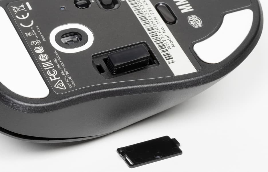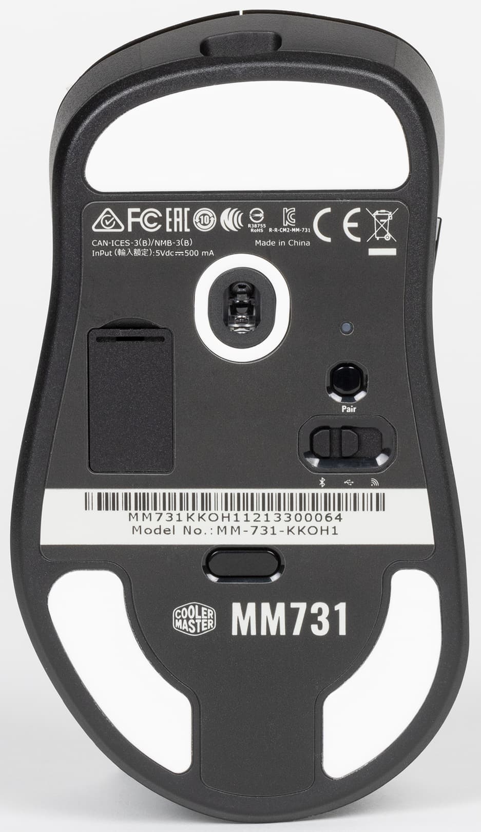 На днище устройства расположены четыре пластины для скольжения, где одна из них окружает окошко сенсор тонкой линией. Сам сенсор расположен в необычном месте – он смещен от геометрического центра ближе к носу манипулятора. Правее и ниже от сенсора расположена кнопка для включения режима сопряжения через Bluetooth и трехпозиционный переключатель: Bluetooth, выключить и радиоканал 2,4 ГГц. Все три положения переключателя обозначены маленькими белыми символами.