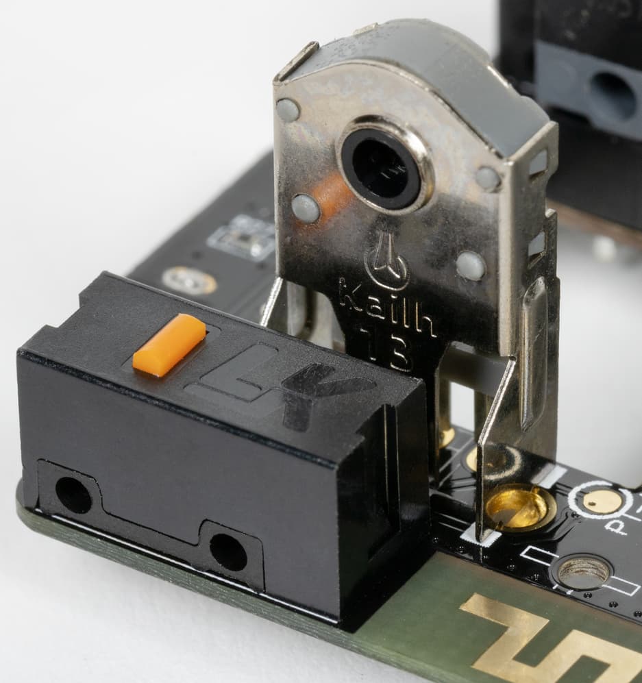 Здесь можно рассмотреть энкодер для колеса прокрутки мышки с маркировкой Kailh и оптические переключатели для основных кнопок LK фирмы A4Tech (Light Strike).