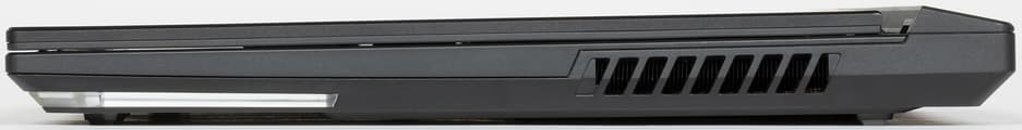 На левой боковой панели помещена решетка выходного отверстия системы охлаждения, затем два разъема USB Type A, стандартный миниджек 3,5 мм для подключения наушников или аудиогарнитуры, а также световод подсветки.