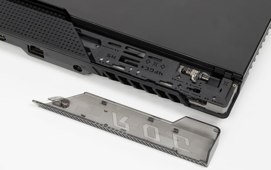 На задней панели заметны решетки отверстий, через которые наружу выбрасывается горячий воздух. Как заведено у производителя, левая решетка образована римскими цифрами MMVI (то есть 2006) — это год рождения серии Asus ROG. Далее помещаются разъемы USB Type A, USB Type С, HDMI, коннектор гигабитного сетевого интерфейса RJ-45 и гнездо для подключения адаптера питания.