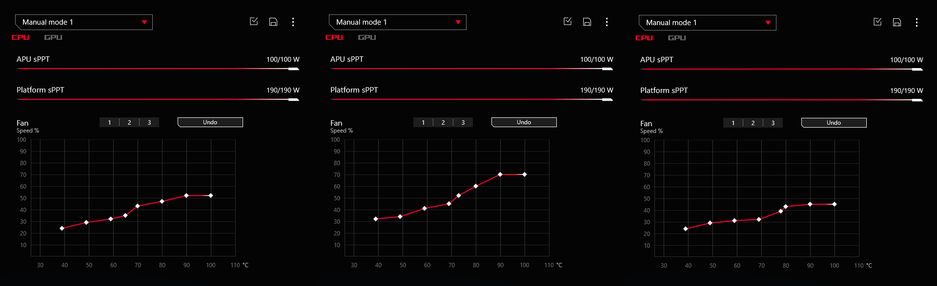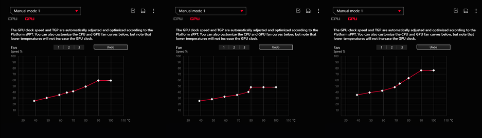Доступны три главных профиля настроек: Silent, Performance и Turbo. В дополнение к ним имеются также Windows (управление передается операционной системе) и Manual (ручные установки). Особенности работы ноутбука в соответствии с тремя главными профилями мы рассмотрим в разделе тестирования ноутбука под нагрузкой. Профиль Manual дает возможность вручную построить кривую реакции кулеров на нагрев CPU и GPU.