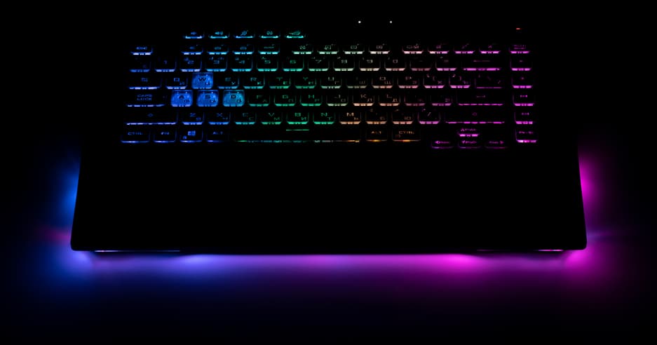 Четыре клавиши геймерской навигации (W, A, S, D) сделаны из полупрозрачной пластмассы с белой подложкой. Клавиатура снабжена подсветкой с двумя уровнями по яркости (третье состояние — выключена), индивидуальной для каждой клавиши (per key RGB). Подсвечиваются сами символы на клавишах и их контуры. Зона подсветки под каждой клавишей видна при отклонении от клавиатуры, но светится мягко и не раздражает. Распределение света позволяет видеть и символы русской раскладки.