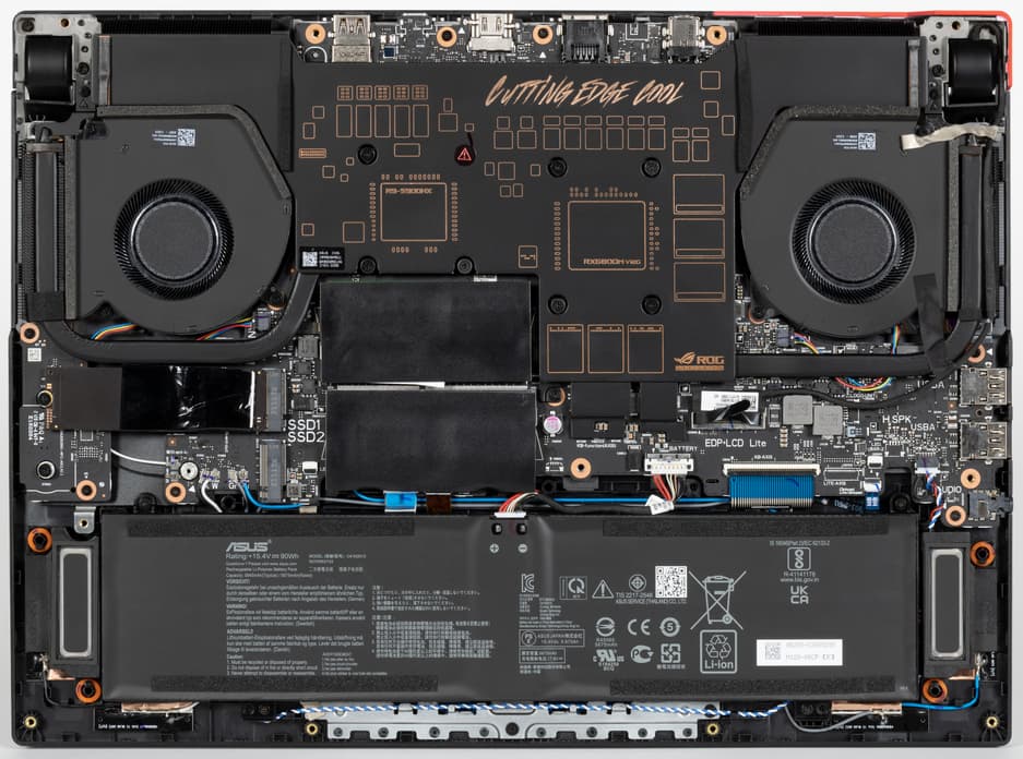 Система охлаждения у Asus ROG Strix G15 Advantage Edition G513QY совершенно новая. Во всяком случае, мы ничего подобного еще не видели ни в портативных компьютерах Asus, ни в ноутбуках вообще. Отведение тепла, как обычно, производится тепловыми трубками, две из которых видны без демонтажа системы: они идут от CPU и GPU к левому и правому боковым радиаторам. Всё остальное (по-видимому, это «всё» — уже не трубки) закрыто сверху широкой пластиной с надписью «Cutting Edge Cool» и схематическим изображением электронных компонентов, которые находятся под ней. Снять пластину нельзя (на одном из винтов имеется заводская пломба), поэтому выяснить доподлинно, что именно под ней скрывается, решительно невозможно.