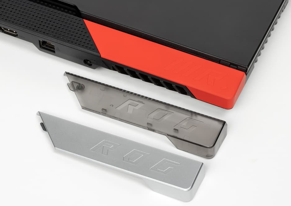 Штатная накладка на угол корпуса — родовой признак ноутбуков ROG. Как мы писали выше, у нашего героя она красного цвета — это намек на то, что оба вычислителя системы (CPU и GPU) изготовлены одним производителем, AMD. А для ненавистников всего красного в комплекте поставки обнаруживаются еще две сменные накладки, совершенно нейтральные по колористике.
