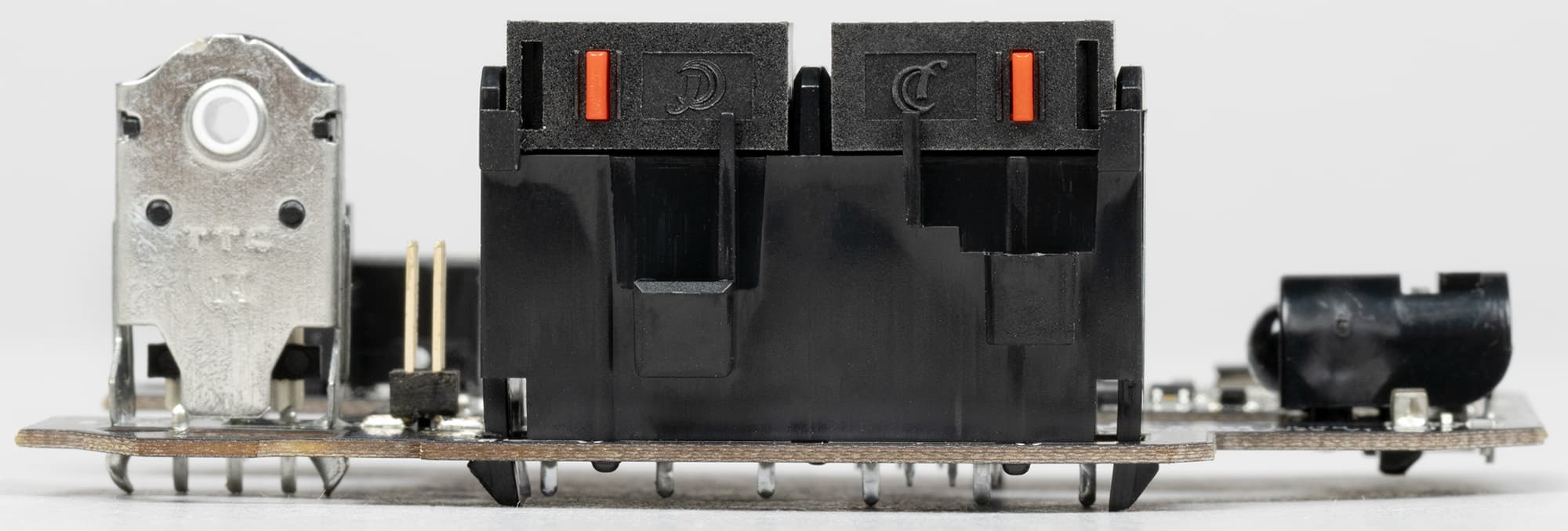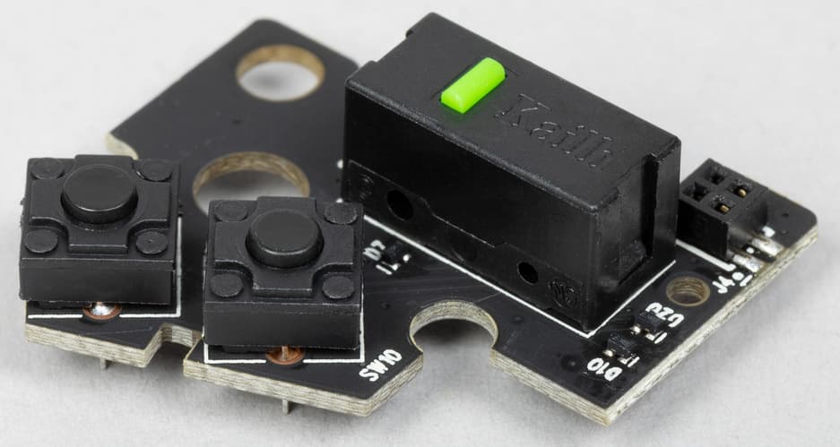 На этой фотографии запечатлен блок переключателей для смены профиля и переключатель под левой кнопкой мыши. Нетрудно заметить маркировку Kailh. Черные переключатели не снабжены какими-либо заметными признаками производителя.