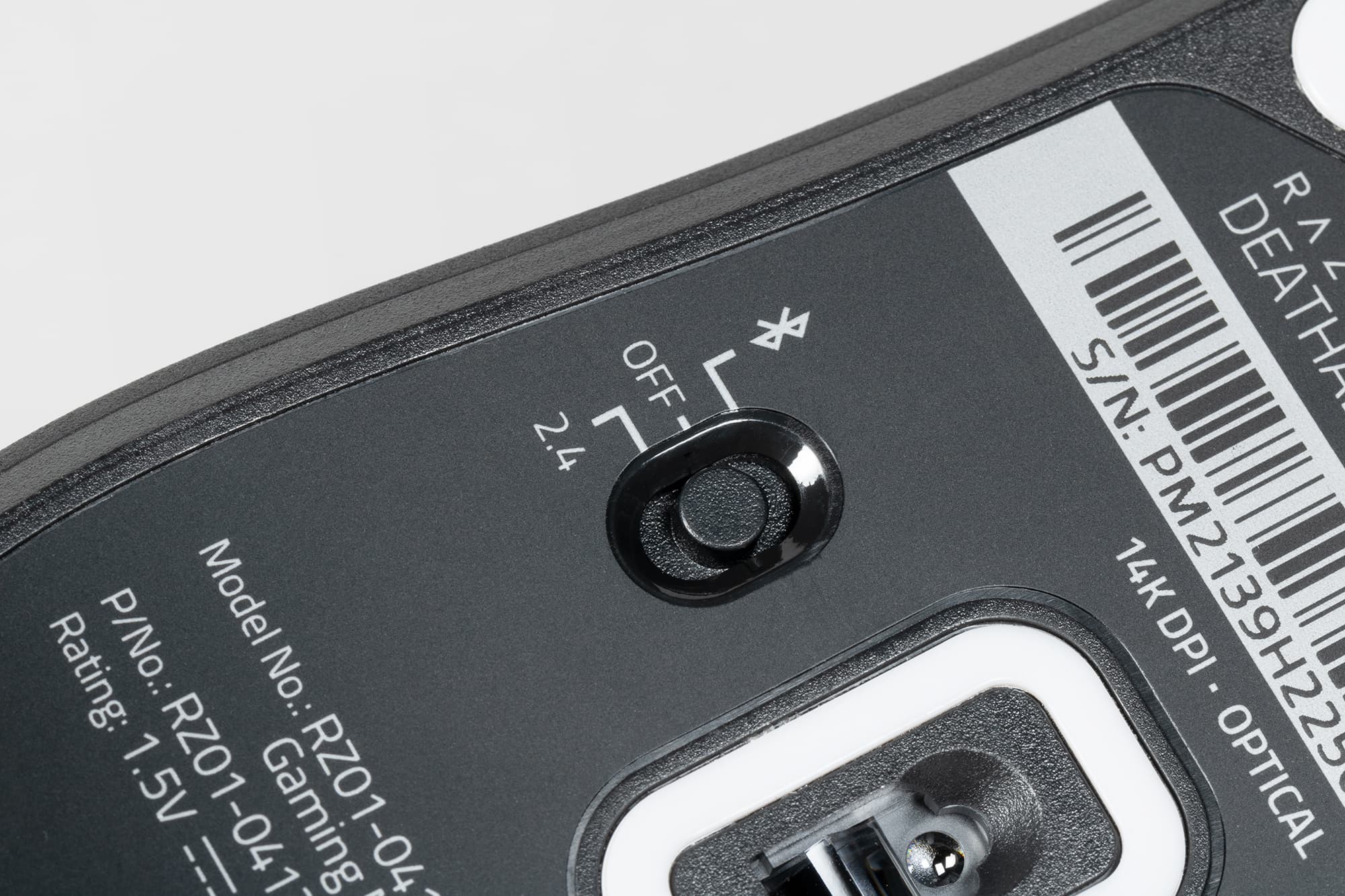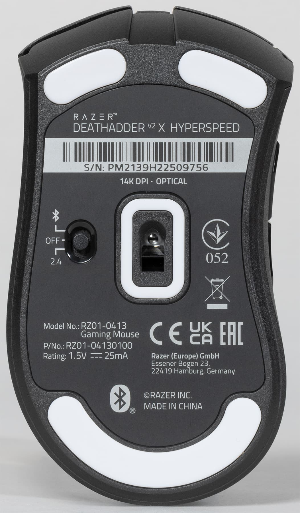На днище устройства, уже традиционно для периферии Razer, расположены белые пластинки из фторопласта (PTFE): две небольшие в верхней части, одна тонкая вокруг окошка сенсора и одна длинная в виде дуги внизу.
