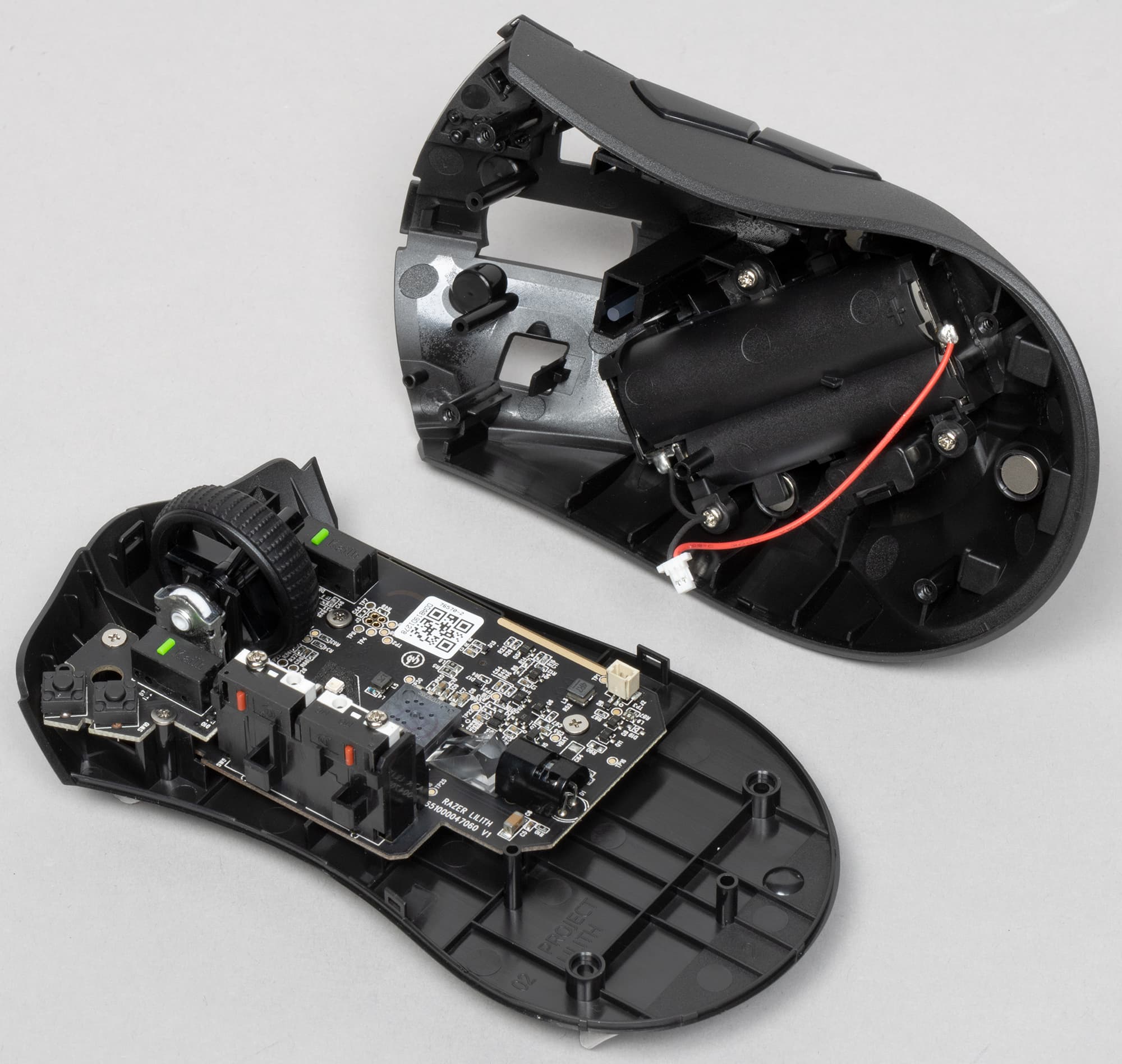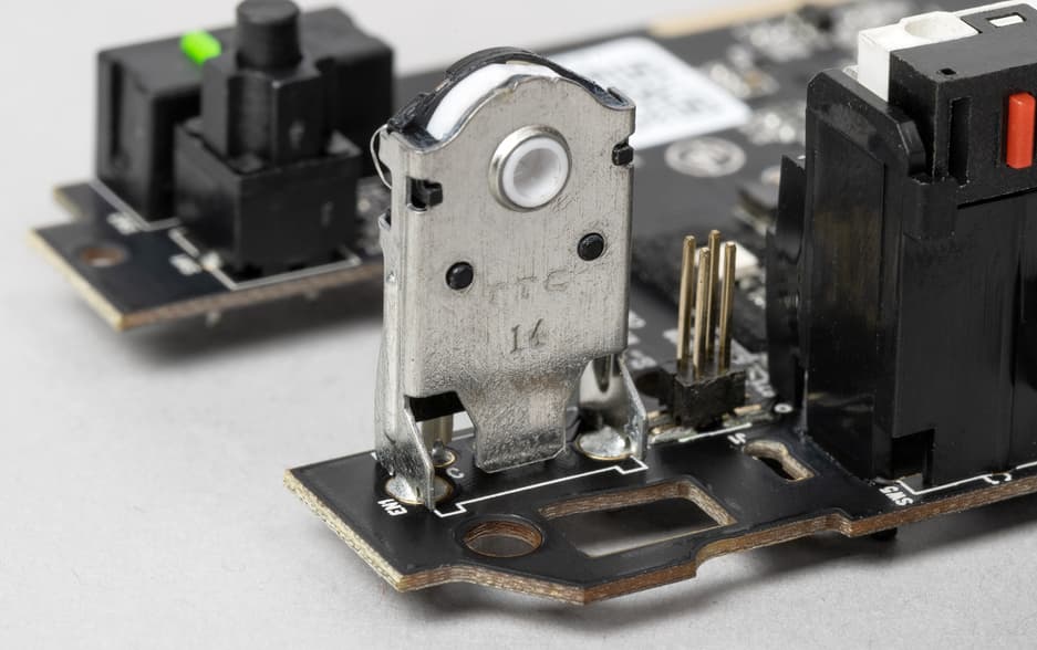 Красные переключатели для боковых навигационных кнопок произведены на заводе Chang Feng (CF). Похожие переключатели применяются в мышке Razer Viper Ultimate.