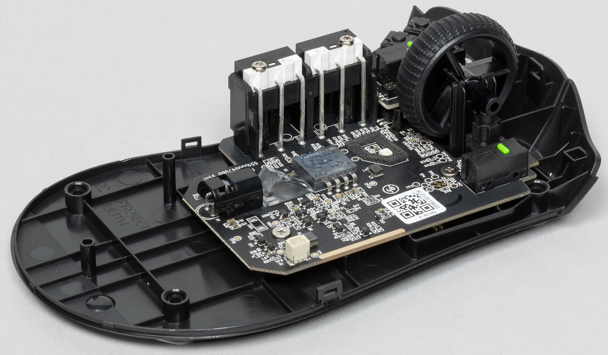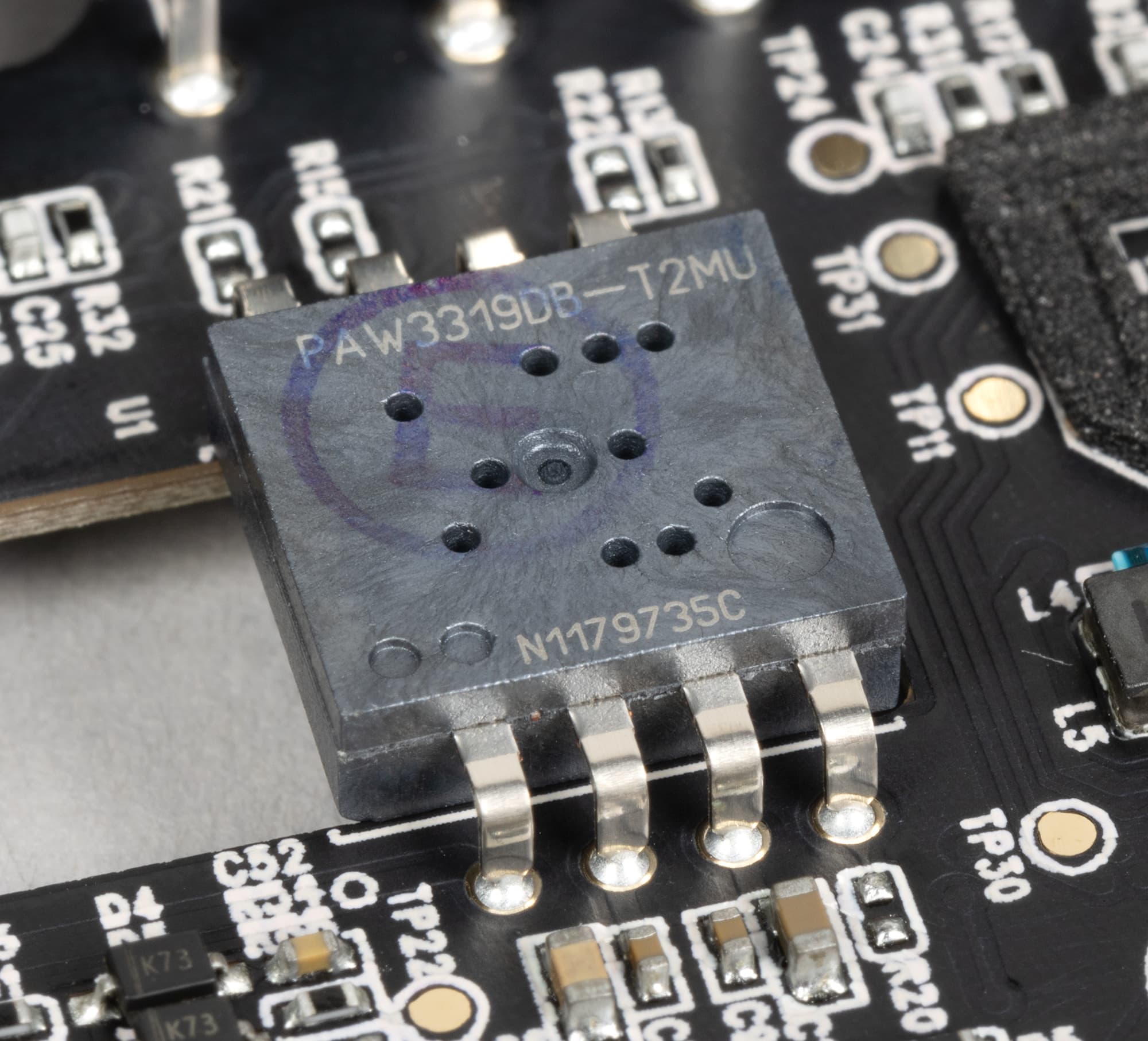 Используется оптический сенсор PixArt PAW3319DB-T2MU с вынесенной призмой и источником инфракрасного света. Аналогичный сенсор применяется в мышке Razer Pro Click Mini.