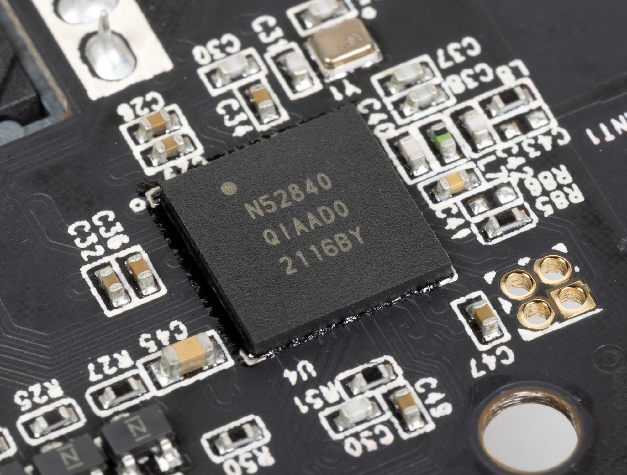 На изображении ниже хорошо виден микроконтроллер Nordic Semiconductor с маркировкой N52840, поддерживающий новейший интерфейс Bluetooth 5.3. Эта однокристальная система отвечает за беспроводное подключение по радиоканалу 2,4 ГГц и Bluetooth. Контроллер сделан на основе 32-разрядного ARM Cortex-M4, причем за шифрование данных отвечает отдельный модуль ARM CryptoCell CC310, есть поддержка Bluetooth Low Energy, Bluetooth mesh, NFC, Thread и Zigbee. Понятно, что контроллер ориентирован на системы умного дома и его возможности для игровой мышки избыточны.