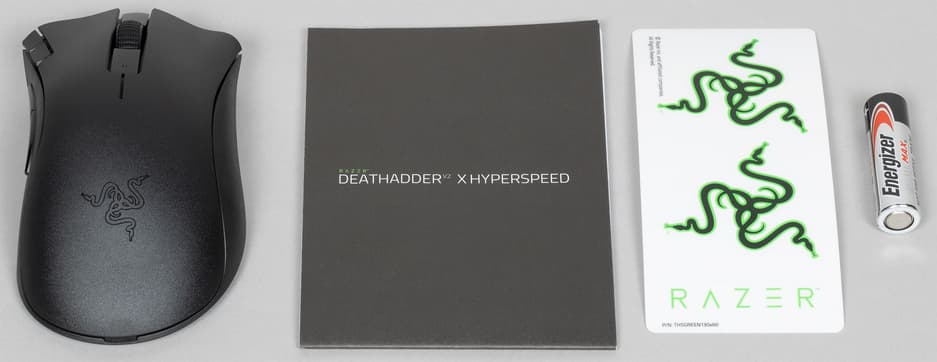 Игровое устройство поставляется в небольшой коробке фирменных цветов. Помимо мышки, в комплекте идет одна батарейка АА, руководство пользователя и наклейки с логотипом Razer. Письмо с пожеланиями от компании объединили с инструкцией пользователя.
