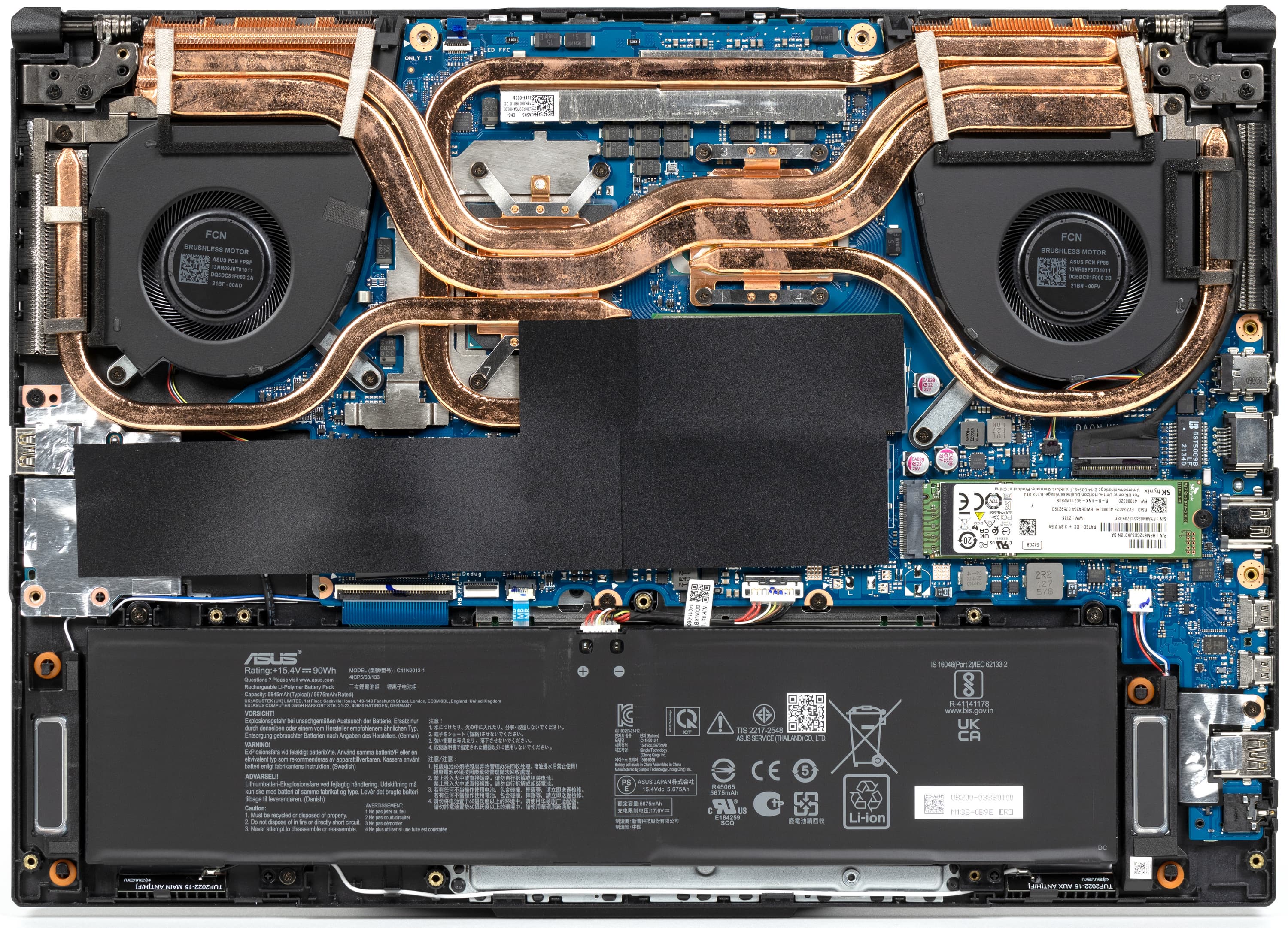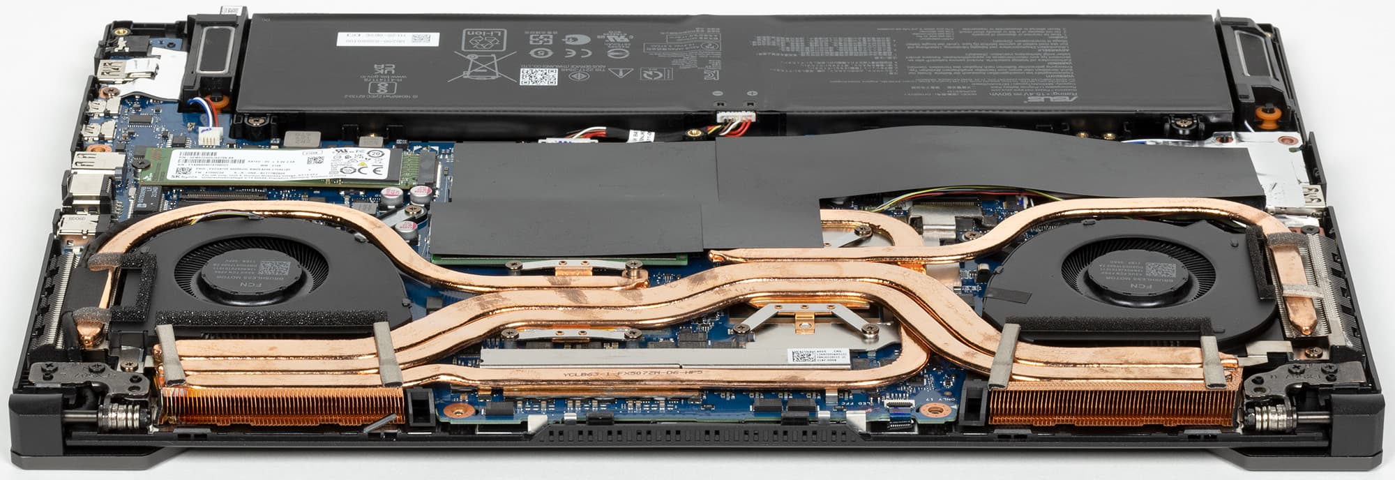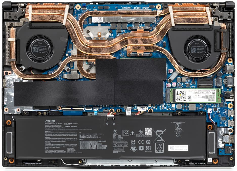 После снятия нижней панели корпуса открывается доступ к кулерам, батарее, SSD-накопителям в двух слотах M.2, модулю беспроводной связи (под одним из SSD) и двум модулям памяти в слотах SO-DIMM.