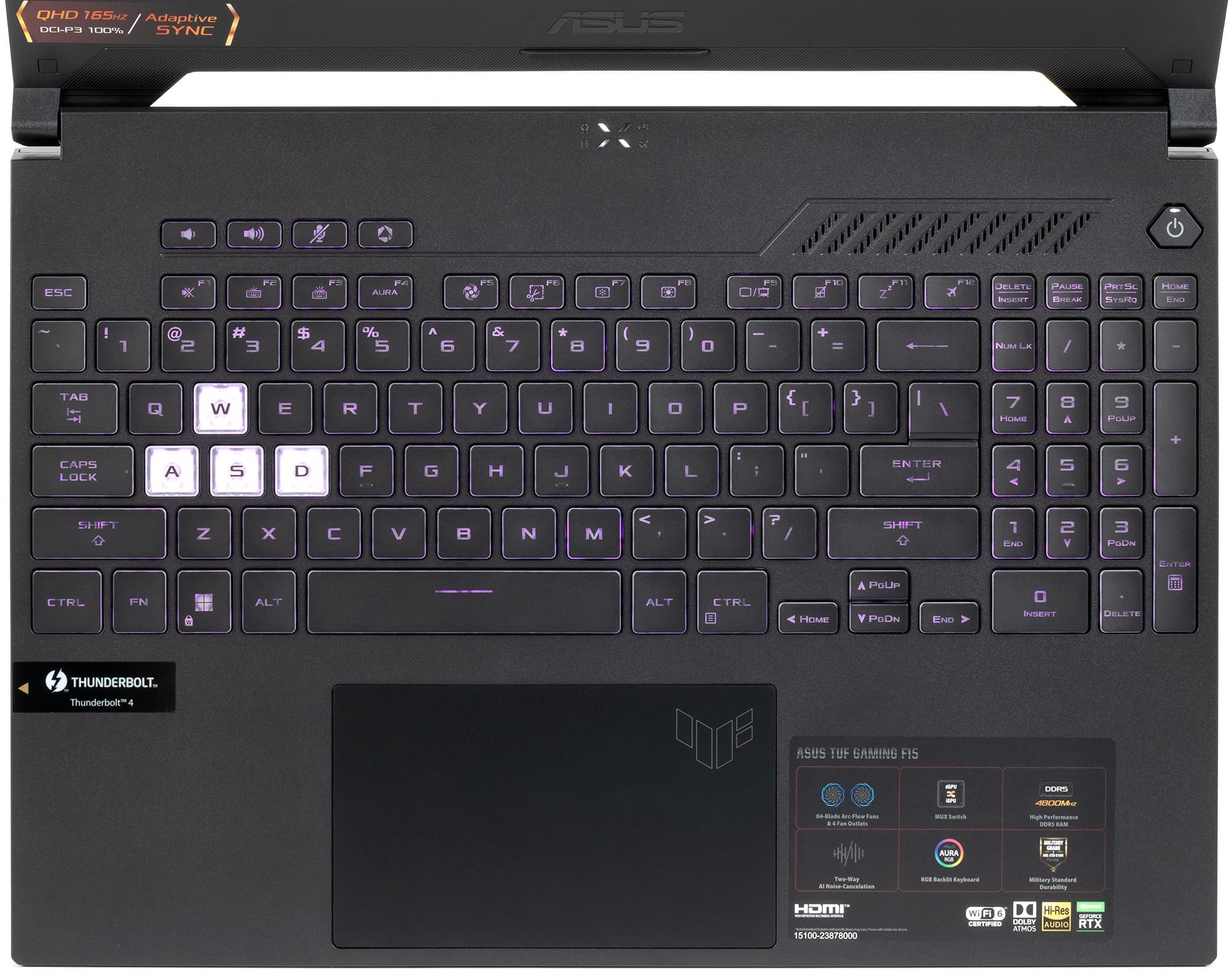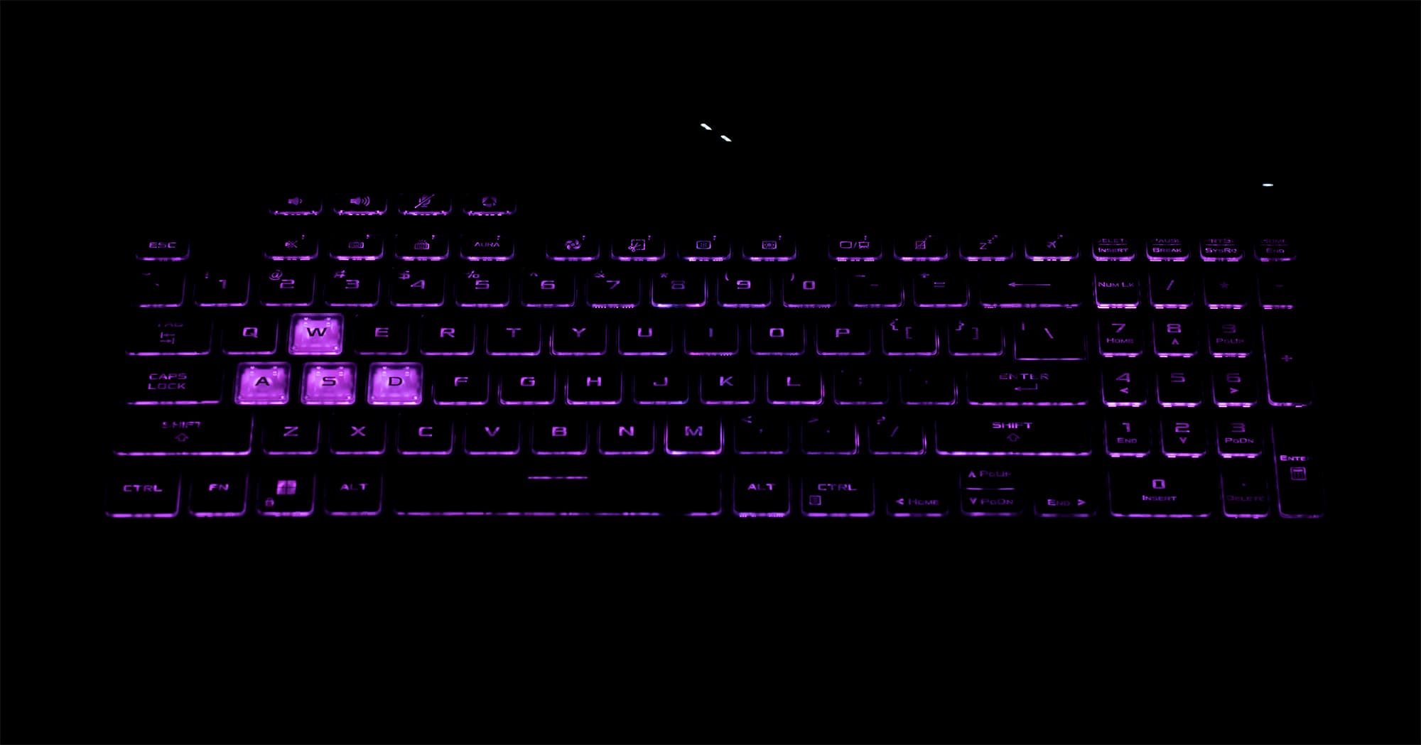 Рабочая поверхность у ноутбука выполнена из типичного немаркого черного пластика. Почти во всю ширину на ней развернута клавиатура, которая даже в 15-дюймовой модели умудрилась сохранить цифровой блок. Имеется трехуровневая по яркости RGB-подсветка, яркость и сконфигурированные режимы (эффекты) можно быстро перебирать с клавиатуры. Настраиваются режимы в фирменной утилите Armoury Crate, но вся клавиатура представляет собой одну зону, то есть цвет-то можно задать любой, однако только для всех клавиш сразу. Особняком стоят полупрозрачные «игровые» клавиши WASD, которые, однако, не отличаются от остальных тактильно.