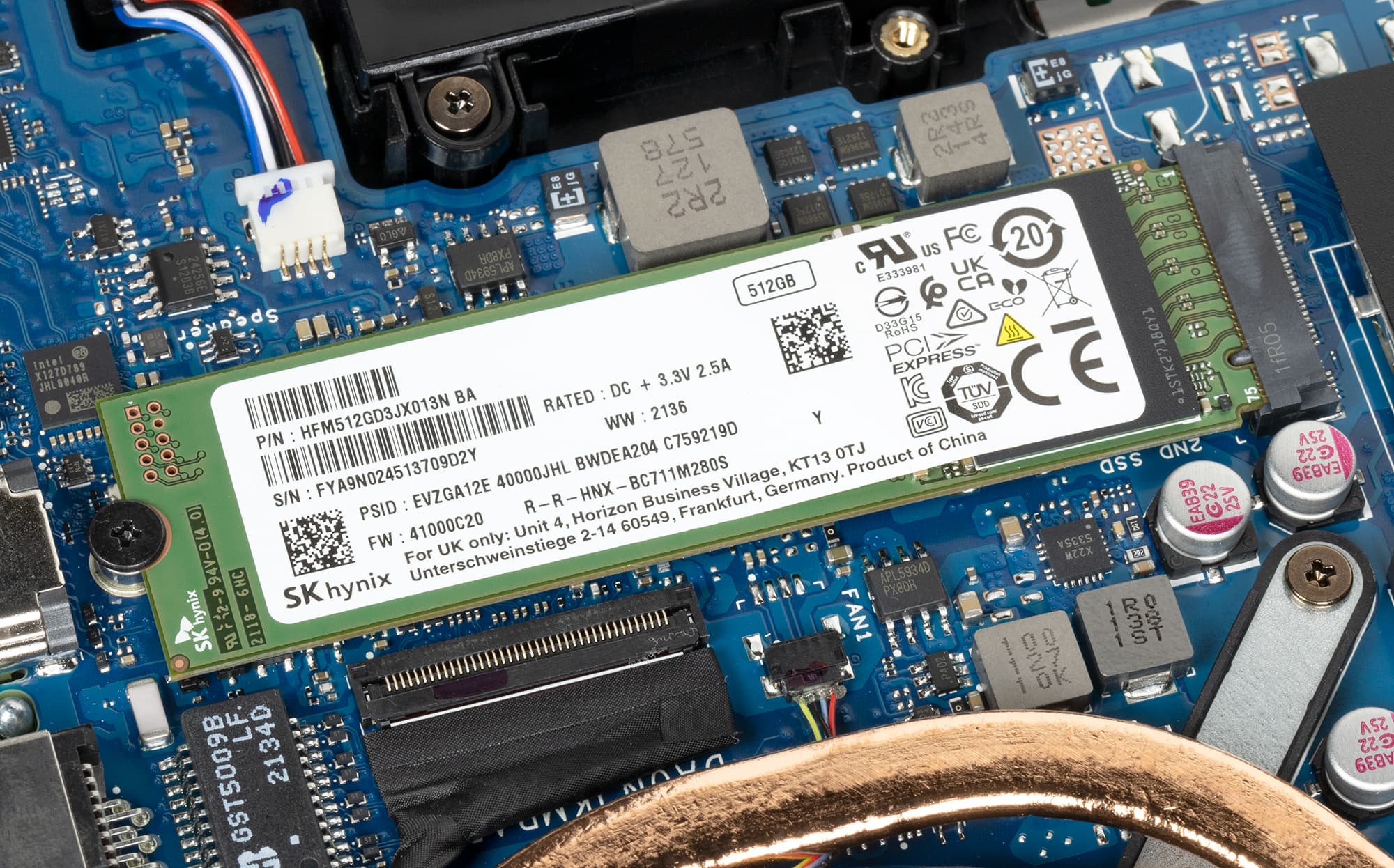 Материнская плата имеет 2 слота M.2, в одном при покупке ноутбука будет стоять SSD-накопитель SK Hynix на 1 ТБ или 512 ГБ, а во второй можно будет самостоятельно установить еще один SSD. Используемые накопители SK Hynix очень быстрые в практическом применении.