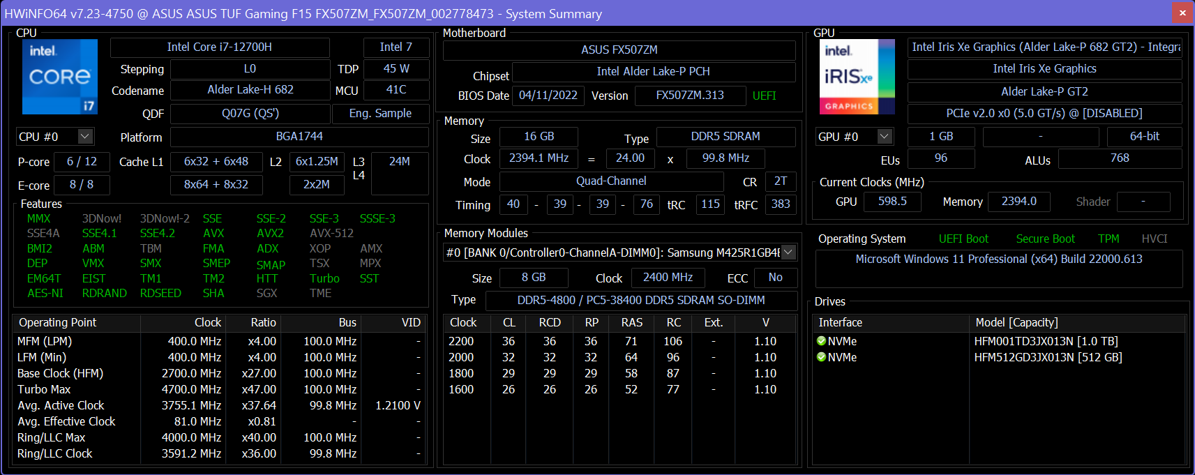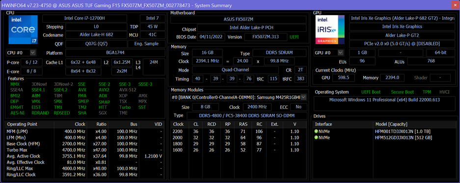 Это первый ноутбук на процессоре Intel Alder Lake с гетерогенным набором ядер, который мы протестировали. У Core i7-12700H 6 так называемых производительных ядер и 8 так называемых эффективных. Максимальный кратковременный показатель потребления энергии в 115 Вт впечатляет, типичный же (долговременный) TDP не изменился по сравнению с прошлыми поколениями и составляет 45 Вт. В протестированном ноутбуке процессор работал ровно с заявленными параметрами по потреблению.