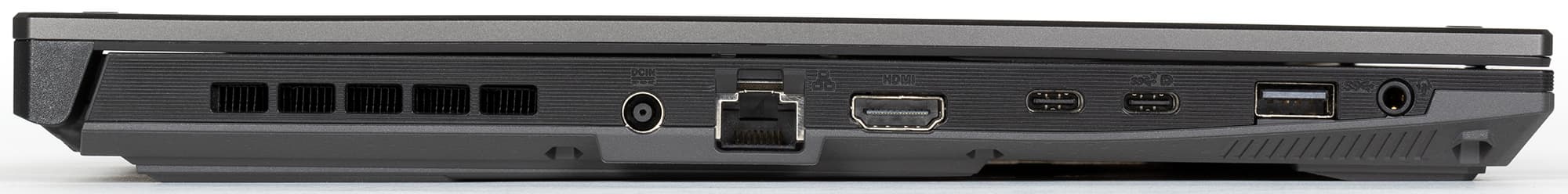 На левом боку расположились разъем питания под фирменный штекер (вставлять его на ощупь неудобно), сетевая розетка без откидной части, видеовыход HDMI 2.0b, два USB Type-C, еще один USB3 Gen1 (Type-A) и комбинированный миниджек (для гарнитуры). Из двух портов USB Type-C дальний от пользователя является на самом деле портом Thunderbolt 4 и поддерживает в том числе вывод графики DisplayPort 1.4, а ближний к переднему краю USB Type-C — полноценный USB3 Gen2, который тоже может служить видеовыходом DisplayPort 1.4 и поддерживает G-Sync. Зарядка через порты USB Type-C не предусмотрена.
