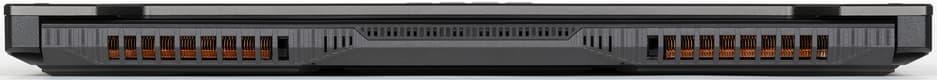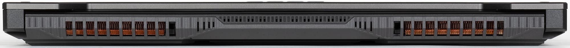 Внешность у ноутбуков серии TUF Gaming характерная. Ломаные линии, брутальность и аскетичность, имитация головок винтов и рельефный логотип TUF на крышке, трапециевидный вырез в основании крышки (благодаря нему видны индикаторы состояния у закрытого ноутбука). Ноутбук далеко не компактный и не легкий, но и рамка вокруг экрана небольшая, и толщина не запредельная (27 мм, за вычетом ножек — 24 мм), и вес едва превышает 2 кг.