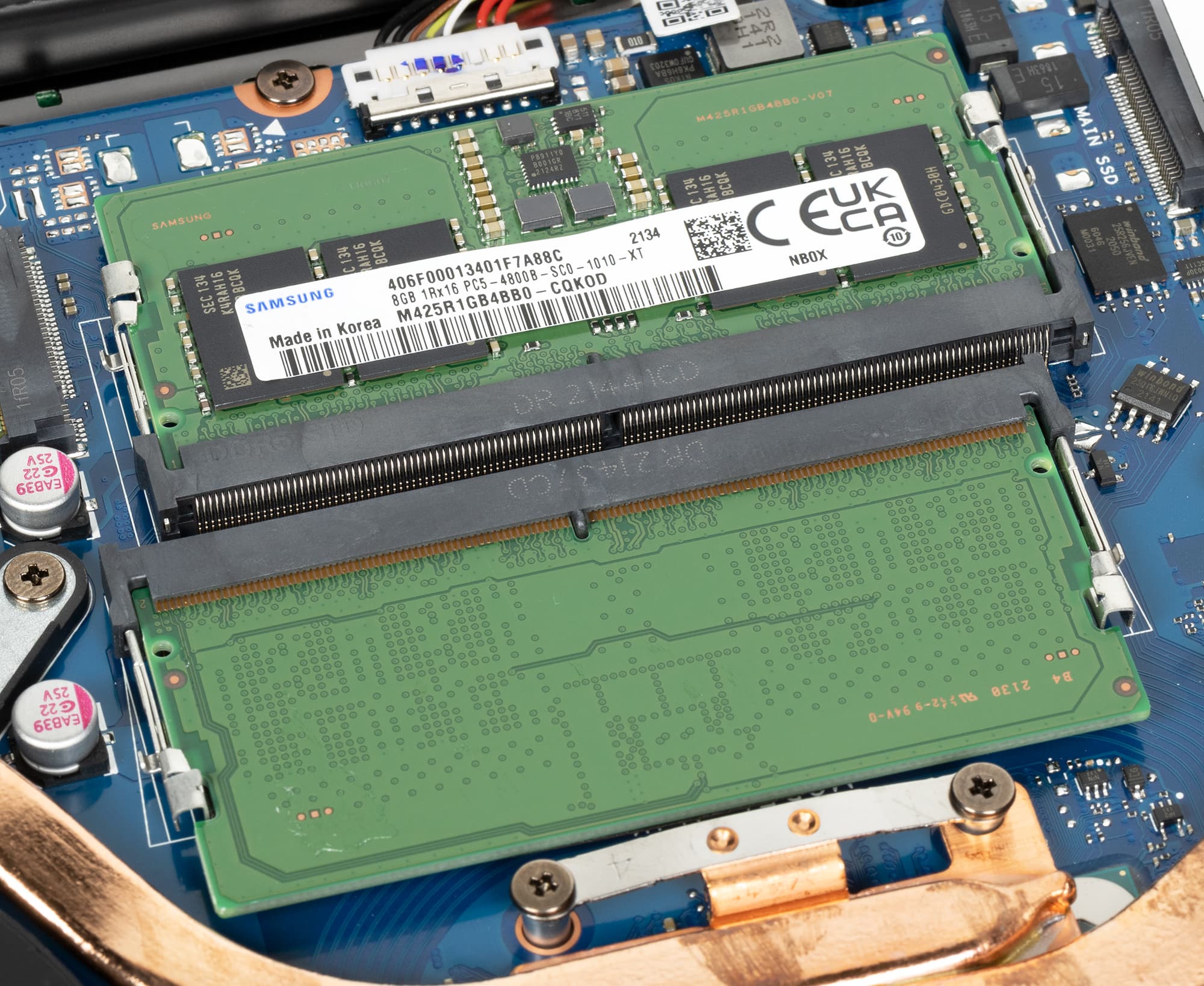 Новые мобильные процессоры Intel поддерживают на выбор DDR4 или DDR5, а также актуальные для ноутбуков мобильные варианты LPDDR4x и LPDDR5. В данном случае используется память нового поколения, причем с довольно высокой частотой (DDR5-4800), и скорость чтения и записи у нее выше, чем у прошлогодних ноутбуков, а латентность сохранена примерно на прежнем уровне. Модули памяти занимают оба слота SO-DIMM на плате, но по крайней мере их можно будет заменить на модули большего объема, если возникнет такая потребность.