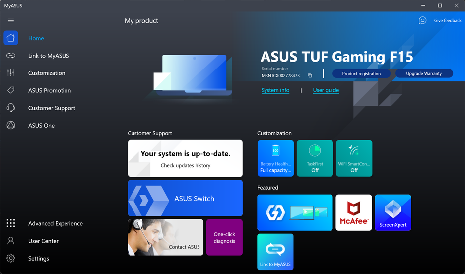 Ноутбук поставляется с Windows 11 или вовсе без ОС. Из набора фирменных утилит выделим MyAsus и Armoury Crate. MyAsus — это сборник информации о системе, средств диагностики, контактов техподдержки, часто задаваемых вопросов и т. д. Также утилита позволяет следить за обновлениями драйверов и фирменного ПО.