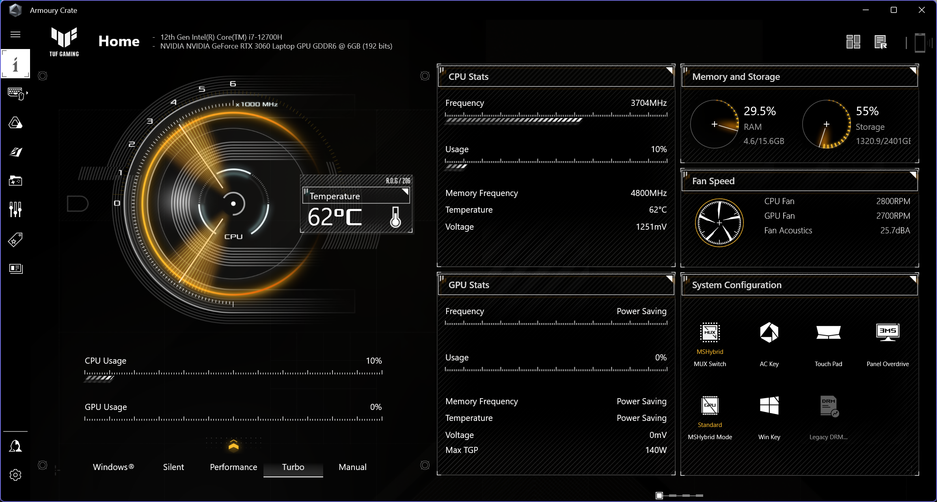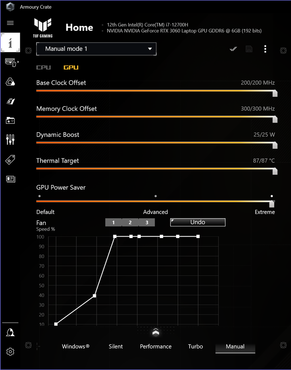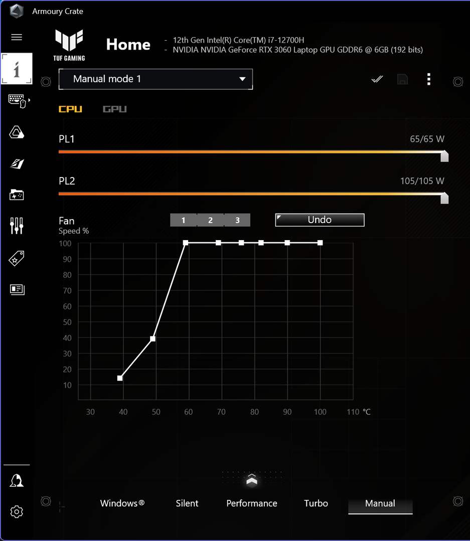 Утилита Armoury Crate отвечает за настройку аппаратной части. Главная ее функция — переключение профилей работы, определяющих производительность и шум ноутбука. Быстро менять профили (циклическим перебором) можно прямо с клавиатуры. Есть возможность задать кривую работы вентиляторов в зависимости от температуры, по отдельности для кулеров CPU и GPU, вручную ограничить два уровня потребления процессора (PL1 и PL2) и настроить частоты и уровень потребления видеокарты (разгонять ее дальше уже некуда, а вот умерить аппетиты можно).