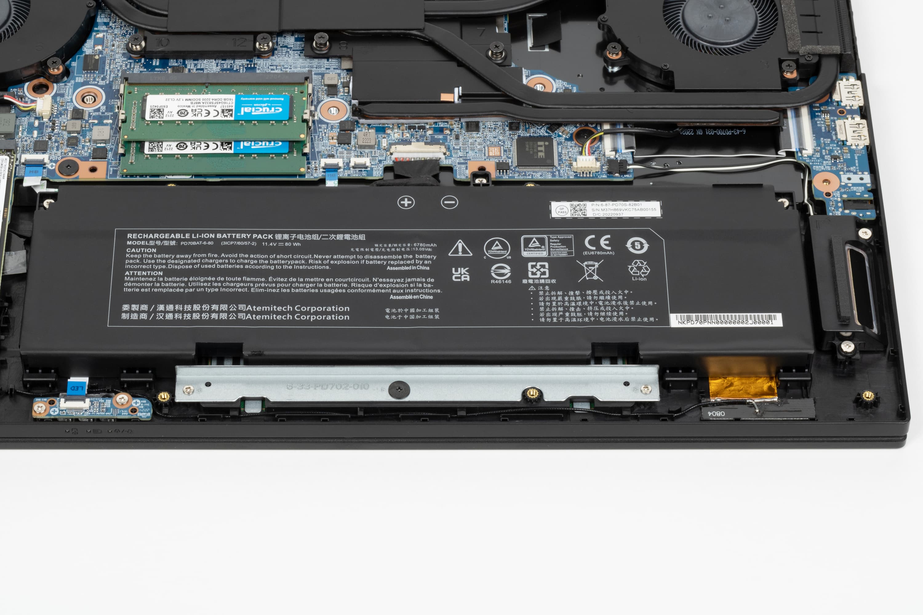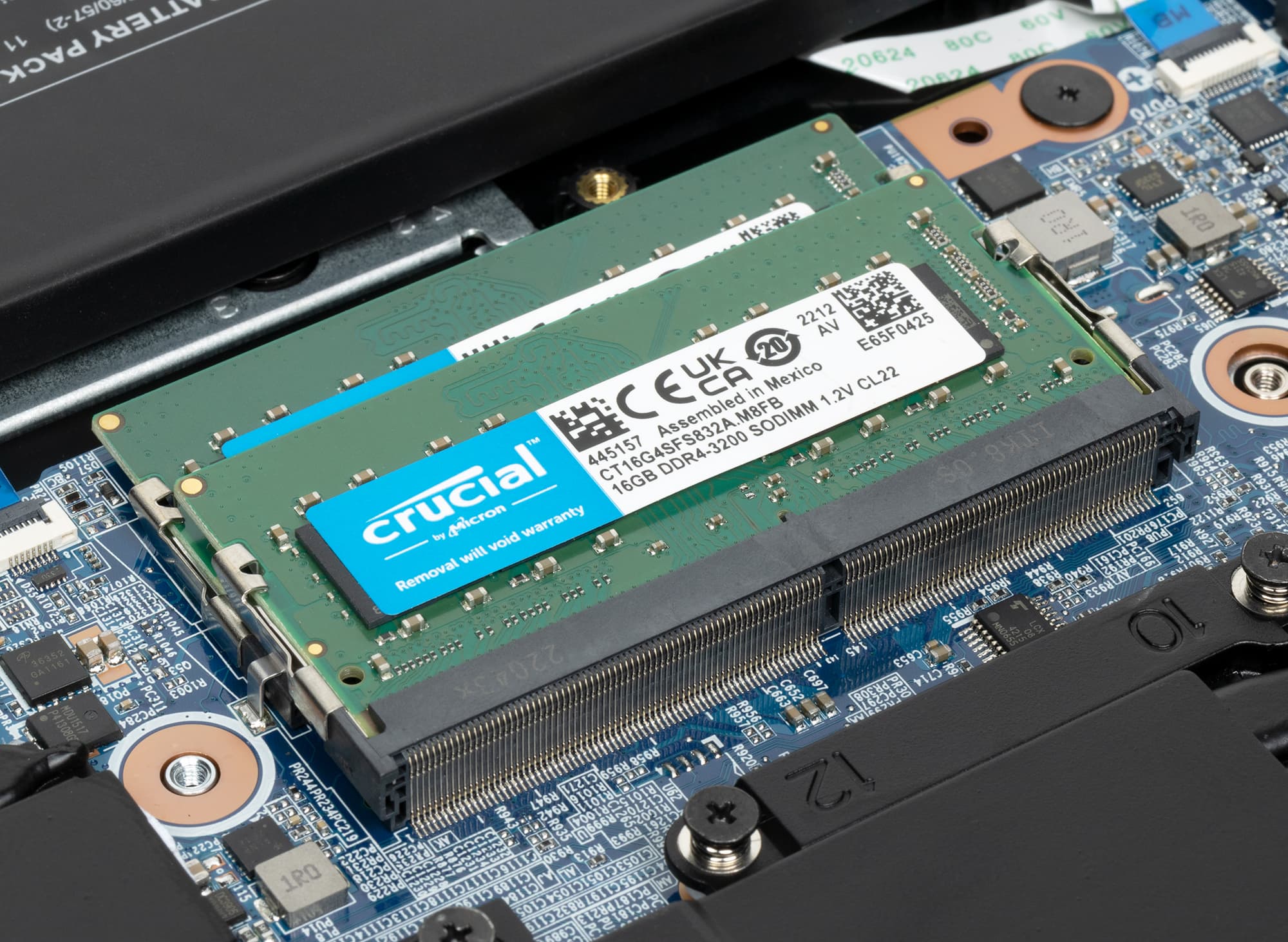 Ноутбук оснащен процессором, который умеет работать с оперативной памятью DDR5-4200, но в слотах установлены два модуля Crucial/Micron по 16 ГБ предыдущего поколения (DDR4-3200). Мы имеем дело с инженерным образцом, а в серийных экземплярах будет устанавливаться память Biwin CMB6-DHDA1BAR08D00 в двух модулях DDR4-3200 по 16 ГБ. Экономия, конечно, значит много, и в игровом ноутбуке скоростные показатели оперативной памяти не столь важны, но если иметь в виду отличную от игровой модель использования навороченной машины, это окажется недостаточно оправданным компромиссом между себестоимостью и быстродействием. У нас еще появится повод вспомнить об этом при тестировании оперативной памяти, а также производительности в реальных приложениях.