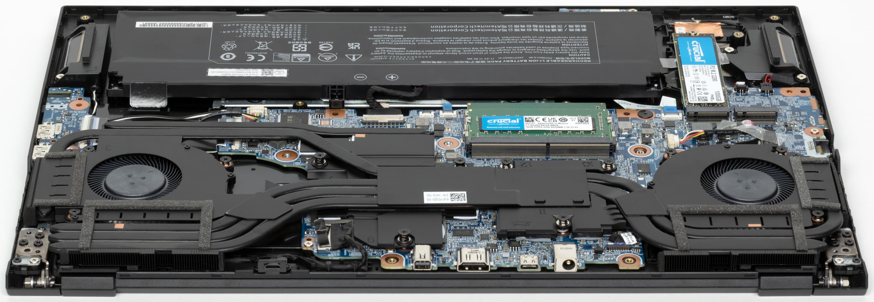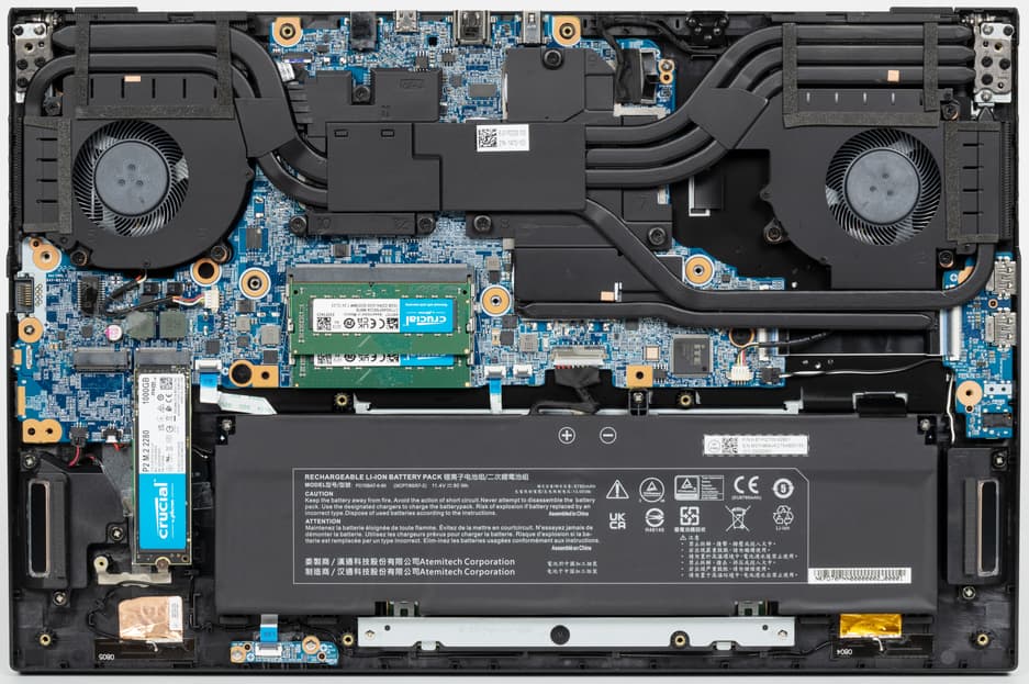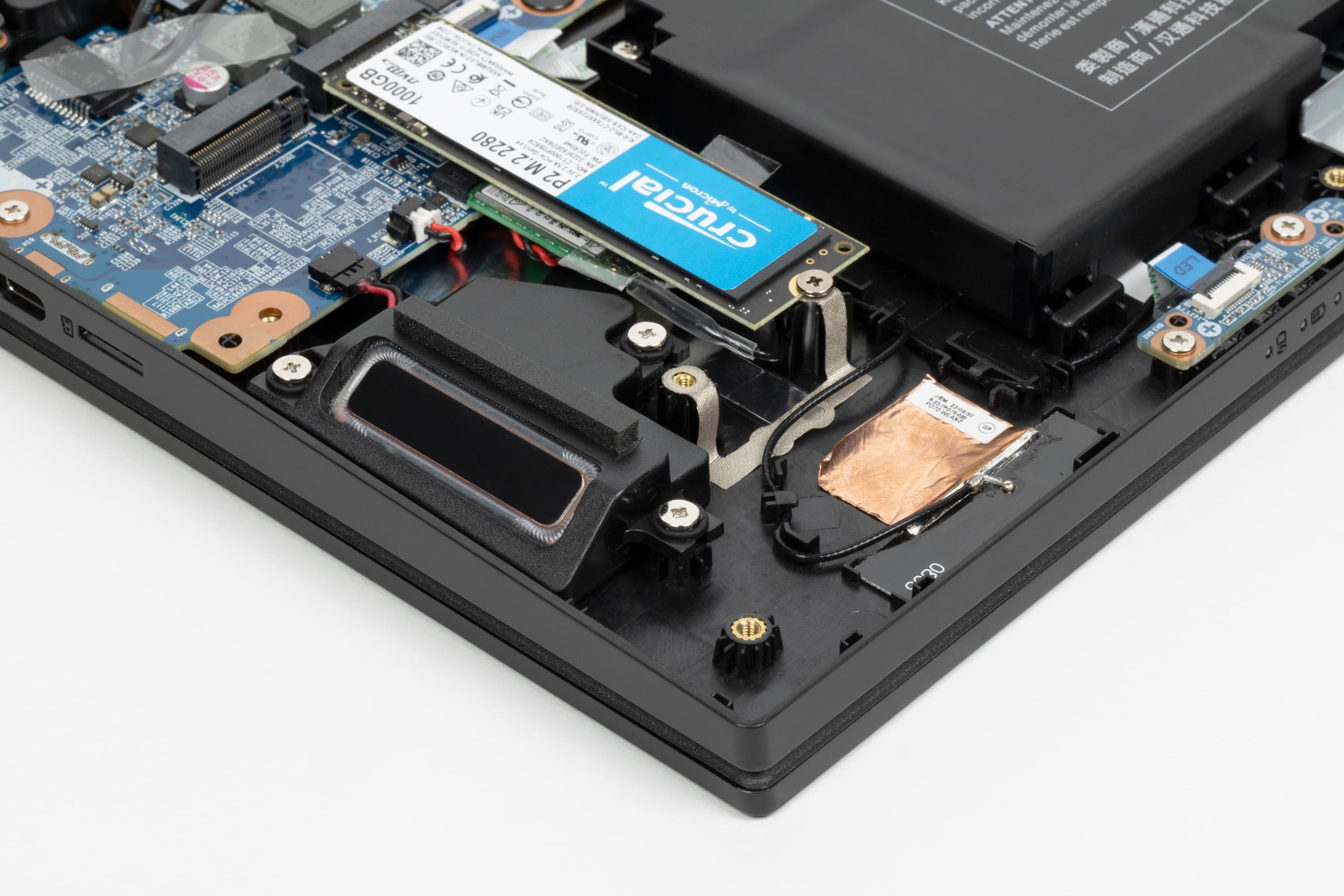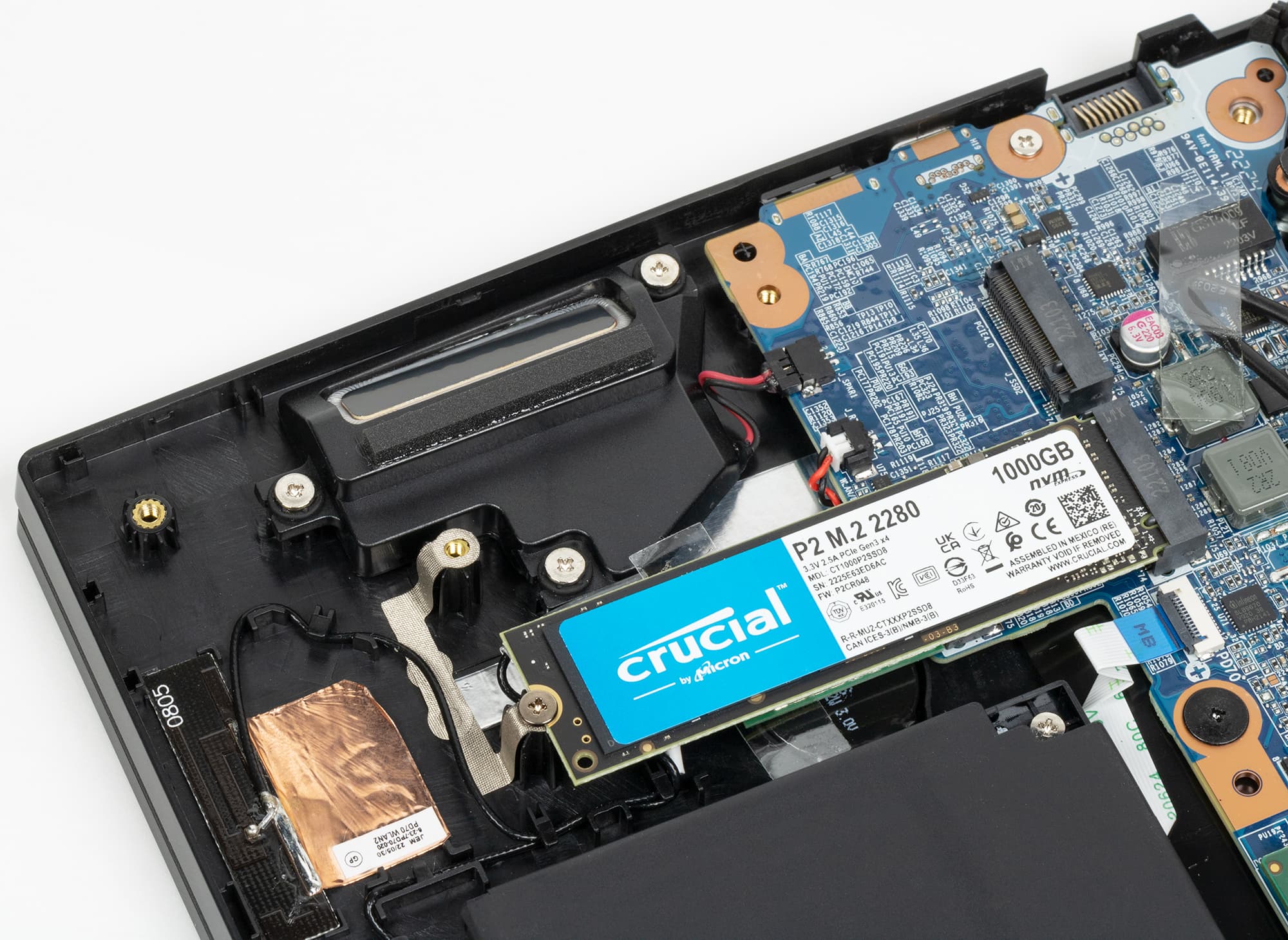 Для SSD-накопителей предусмотрено два слота M.2. В первом из них в нашем инженерном образце установлено NVMe-хранилище Crucial (Micron) CT1000P2SSD8 (PCI Gen 3×4). Процессор Intel Core i9-12900H способен обслужить до и PCIe Gen 4×4, но (как и в ситуации с оперативной памятью) предпочтение было отдано опции подешевле. Неформатированная емкость составляет 1 ТБ, в рабочей конфигурации со служебными разделами доступное пользователю пространство уменьшается до 930 ГБ, а после установки Windows 11 сокращается еще на 40—50 ГБ. В серийных ноутбуках будет устанавливаться другой накопитель аналогичного объема — Biwin CE480T5D101.