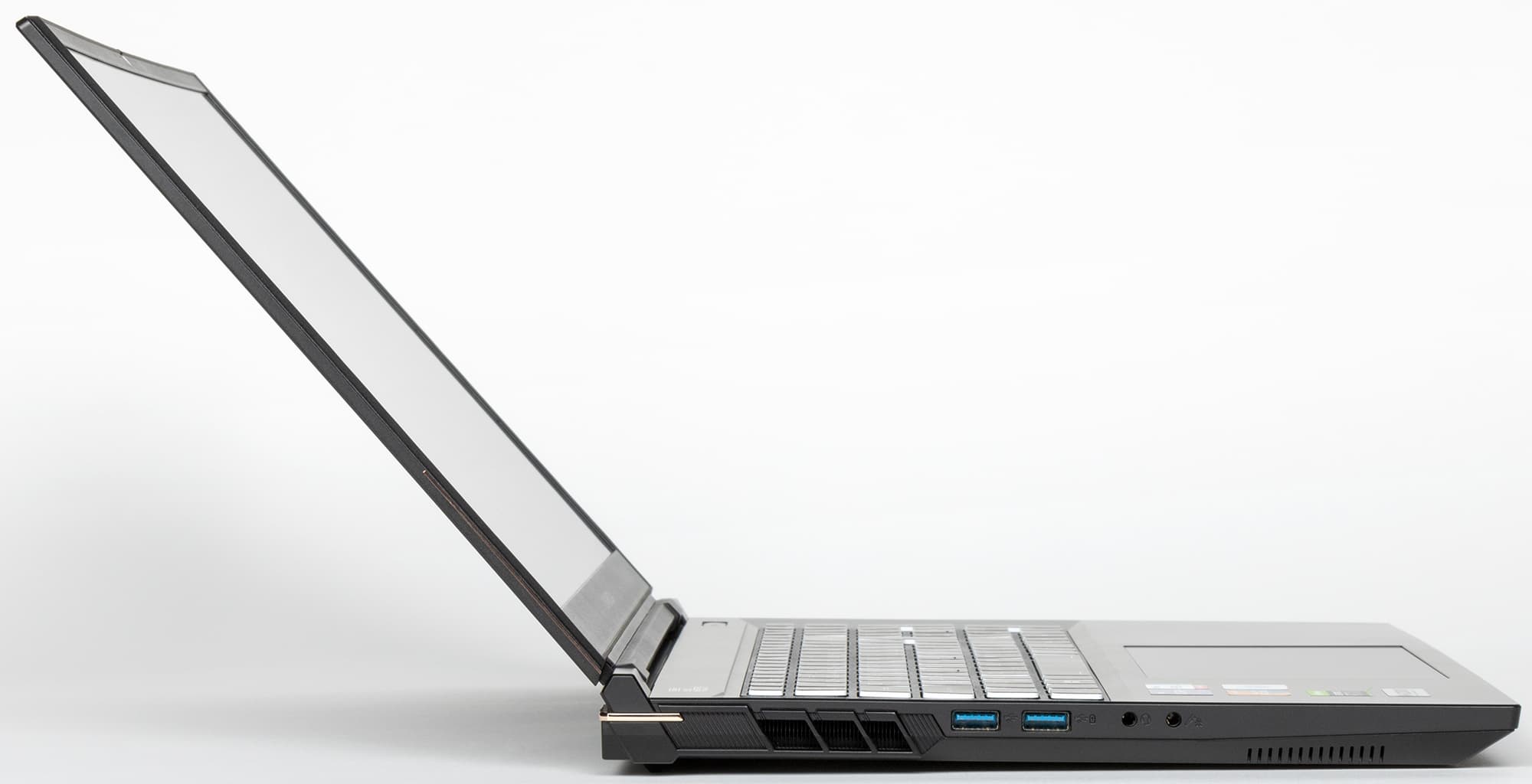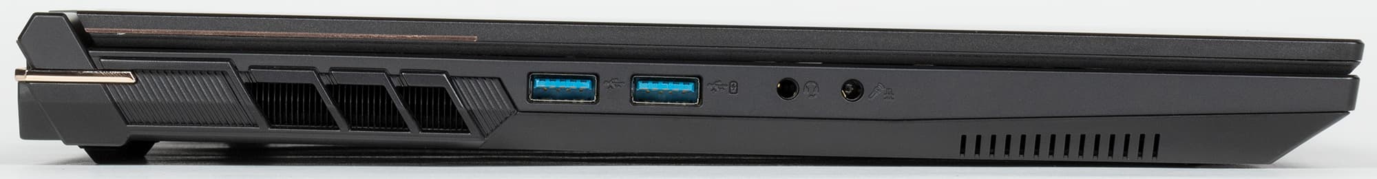На левой боковой панели обнаруживаются решетка выходного отверстия системы охлаждения, два разъема USB Type A, аудиовыход на наушники и входной разъем для микрофона (миниджеки 3,5 мм).