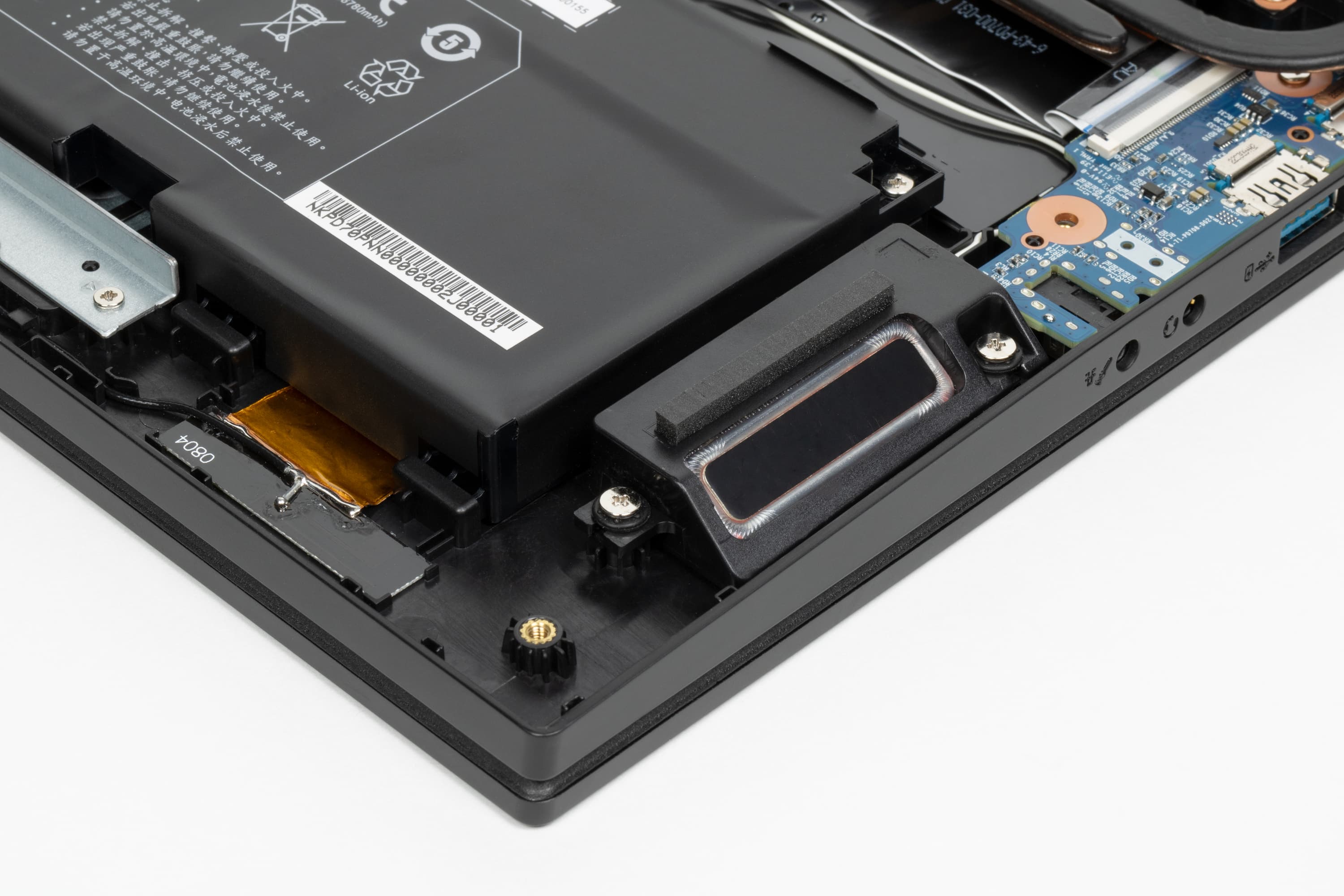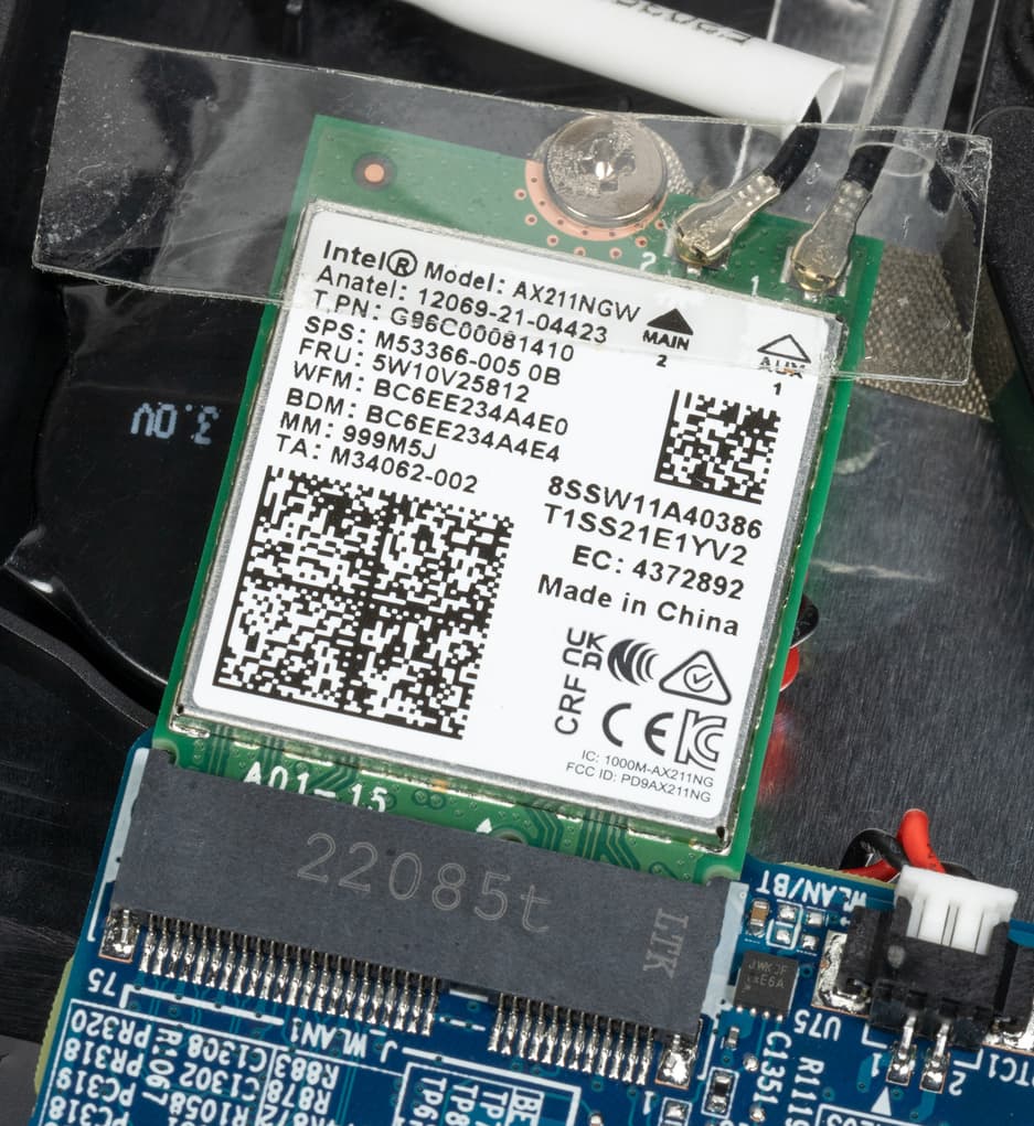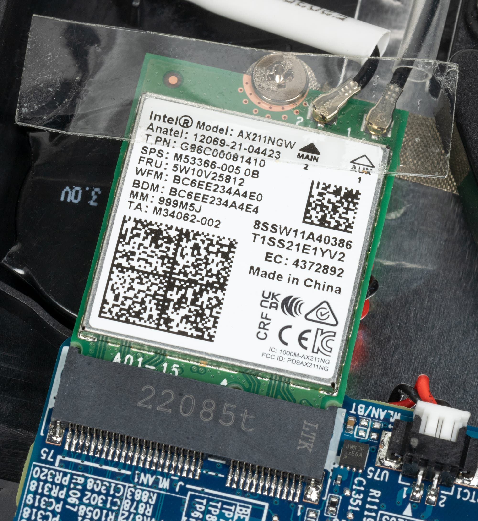 Под системным накопителем помещается вполне современный высокоскоростной трехдиапазонный адаптер (2,4/5/6 ГГц) беспроводной связи Intel AX211NGW стандарта IEEE 802.11ax (Wi-Fi 6E) с поддержкой одновременного приема и передачи данных с помощью двух антенн (2T2R MU-MIMO). Он же реализует связь по Bluetooth 5.2 Dual Band. На сегодняшний день адаптер Intel AX211 — это одно из топовых устройств радиосвязи для мобильных ПК.