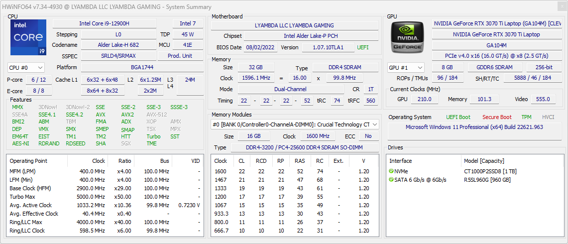 Мы испытали инженерный образец игровой машины, оснащенной экраном 17,3 дюйма по диагонали с хорошим цветовым охватом, низким значением задержки вывода (11 мс), но невысокой яркостью. Ноутбук заключен в металлический корпус, снабжен всеми необходимыми интерфейсами, включая RJ-45 для подключения к LAN 1GboE, и обладает трехдиапазонным беспроводным адаптером Intel AX211 с поддержкой стандарта 802.11ax. Аппаратное оснащение завидное: центральный процессор Intel Core i9-12900H и видеокарта Nvidia GeForce RTX 3070 Ti Laptop с 8 ГБ GDDR6. Нас несколько смутил выбор разработчиками не самой быстрой оперативной памяти DDR4-3200 и недостаточно проворного твердотельного накопителя, емкость которого, впрочем, вполне достаточная.