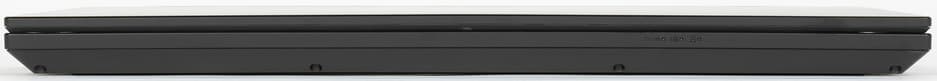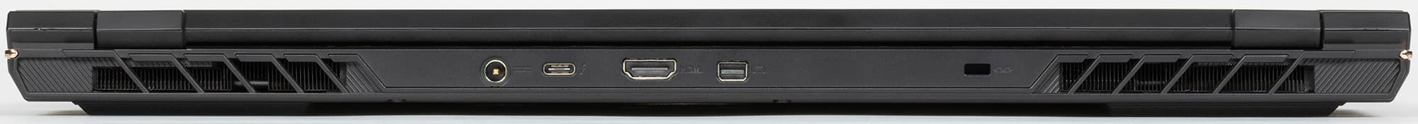Справа и слева на задней панели видны решетки отверстий, через которые наружу выбрасывается горячий воздух. Между ними помещаются коннектор адаптера питания, разъем USB Type С, видеовыход HDMI, интерфейс mini DisplayPort, а чуть поодаль, правее, — отверстие для кенсингтонского замка.
