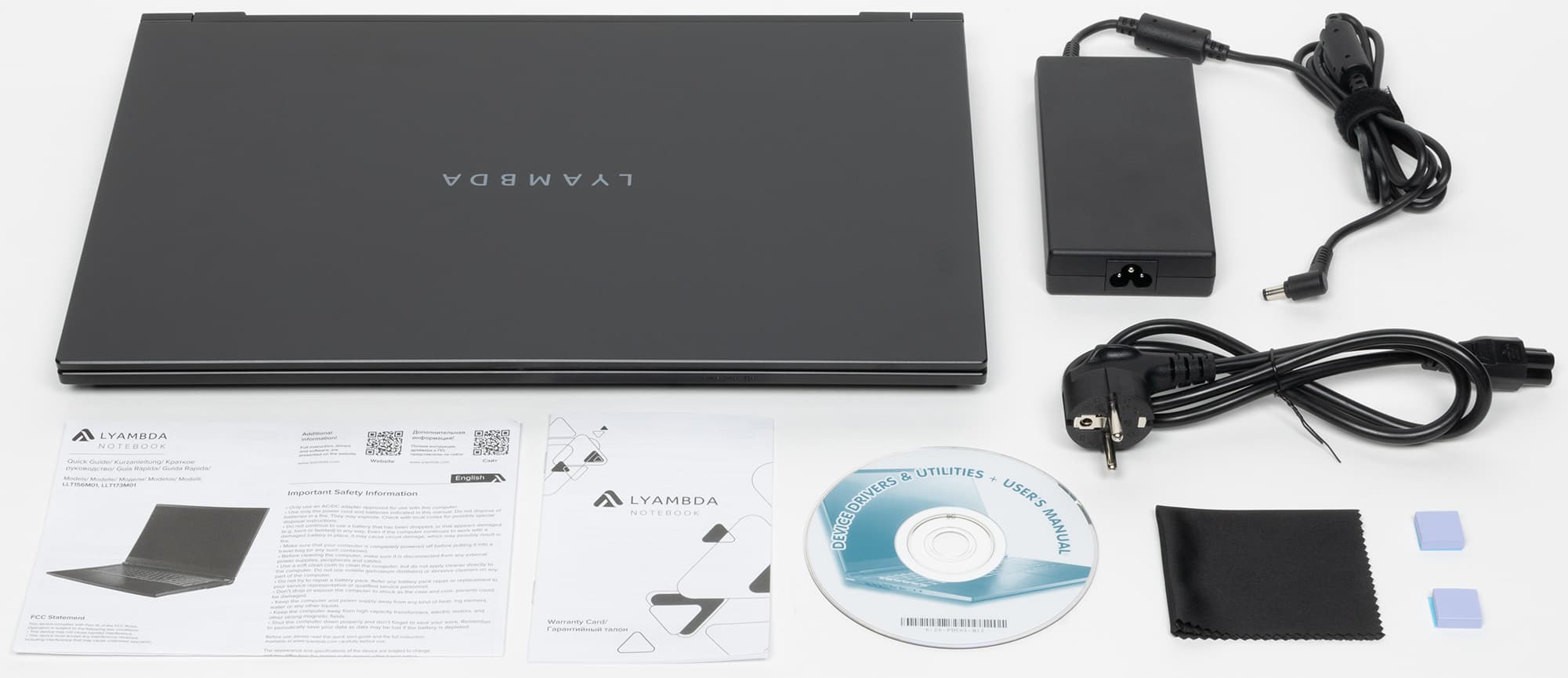 В картонном чемоданчике помимо самой «Лямбды» сыскались: адаптер питания, который подходит для работы от сети переменного тока 50/60 Гц под напряжением 100—240 В и обеспечивает на выходе 20 В при силе тока 11,5 А (мощность 230 Вт), руководство пользователя, в котором подробно описано, как устанавливать нужное ПО и как пользоваться разными клавиатурными аккордами, сувенирный кусочек микрофибры, а также давно не виданный в комплектах поставки компьютеров компакт-диск с драйверами и утилитами, который при учете отсутствия в машине привода для его чтения воспринимается, мягко говоря, неоднозначно.