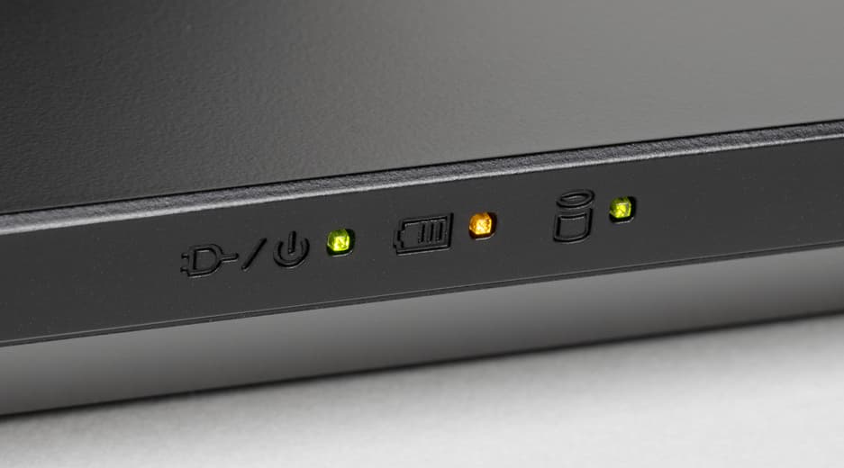 Левый сигнализирует о подключенном адаптере питания, средний — о том, что происходит заряд батареи (горит желтым до достижения 100% заряда, затем переключается на зеленое свечение), правый отражает активность системного накопителя.