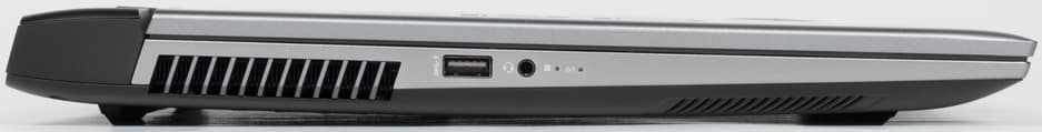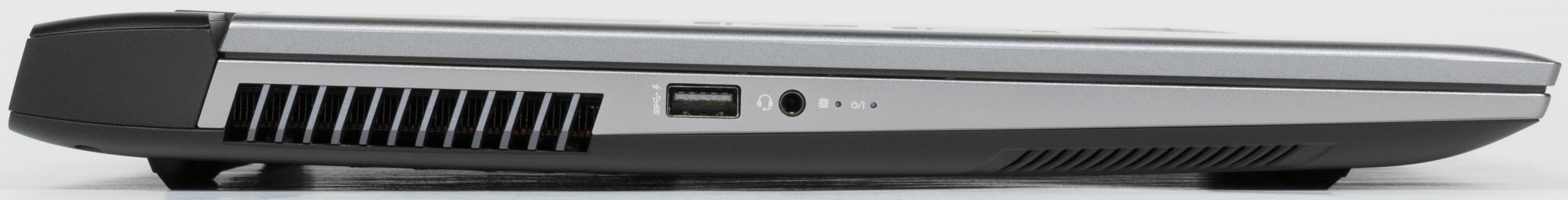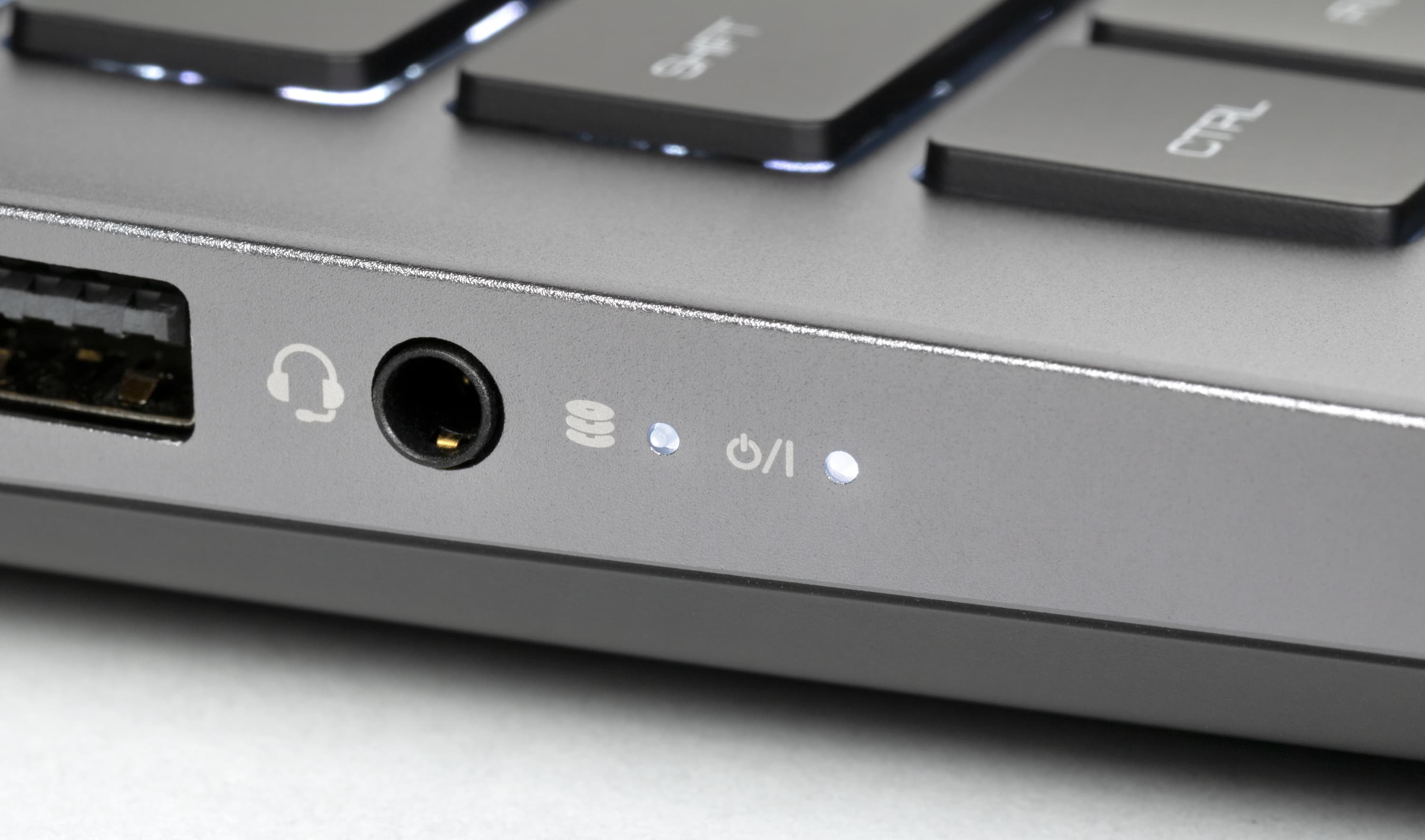 Слева – порт USB3 Gen1 Type-A, комбинированный миниджек для аудиогарнитуры и два индикатора: один отображает дисковую активность, второй горит белым при включении и медленно мигает в режиме сна (вот только при нормальном расположении оператора все эти индикаторы не видны). Порт USB-А помечен значком молнии, что означает возможность подключения к нему устройств для зарядки (в том числе от «спящего» ноутбука), но максимальный допустимый ток нигде не обозначен, а в BIOS есть установка «USB Charger Support», которая по умолчанию имеет значение «Disabled».