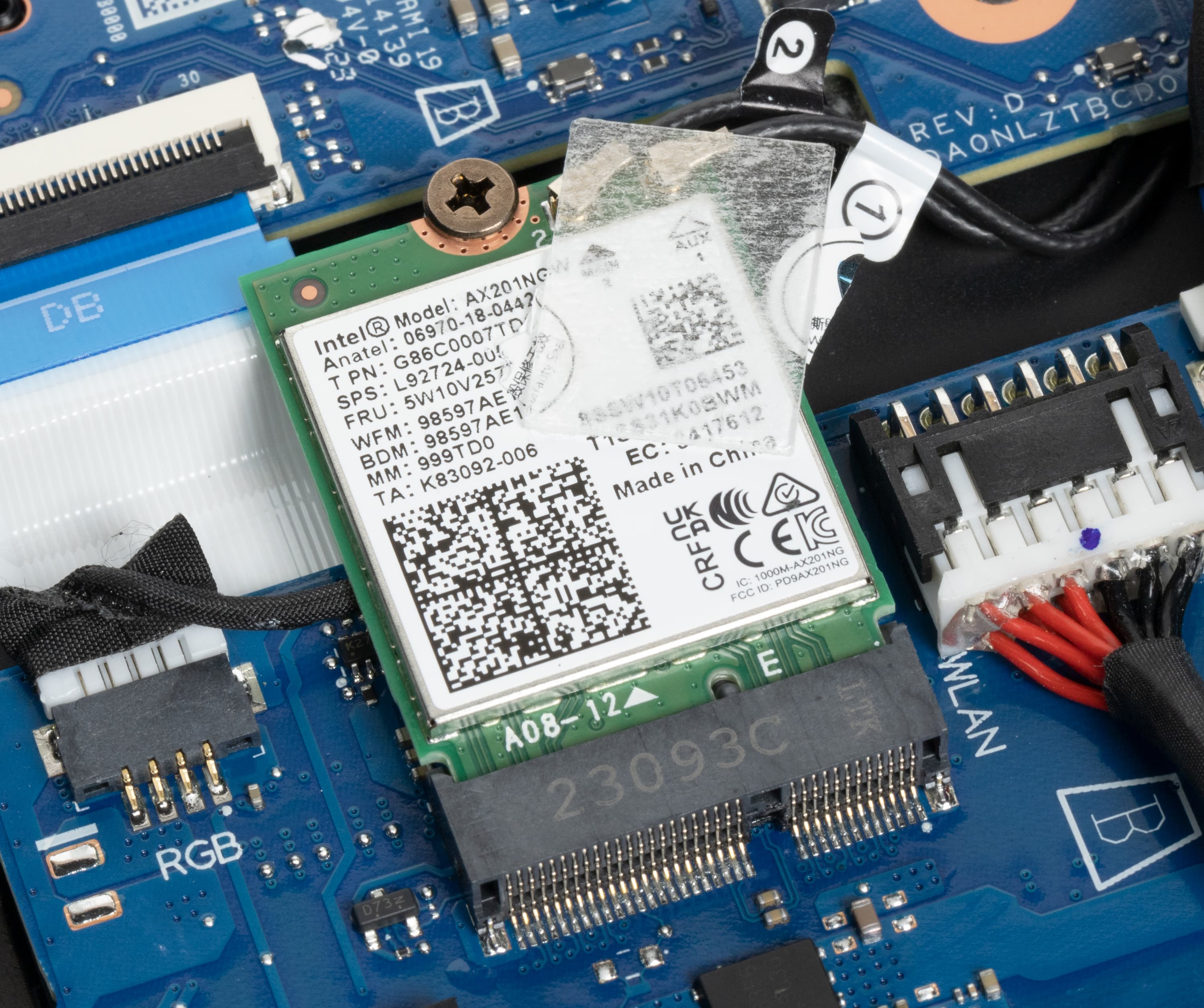 На плате хорошо заметны (и легко доступны) слоты под модули SO-DIMM и накопители – один уже установлен, второй подобный SSD можно добавить в свободный слот М.2, винт для крепления имеется. В ещё один слот установлен модуль беспроводной связи.