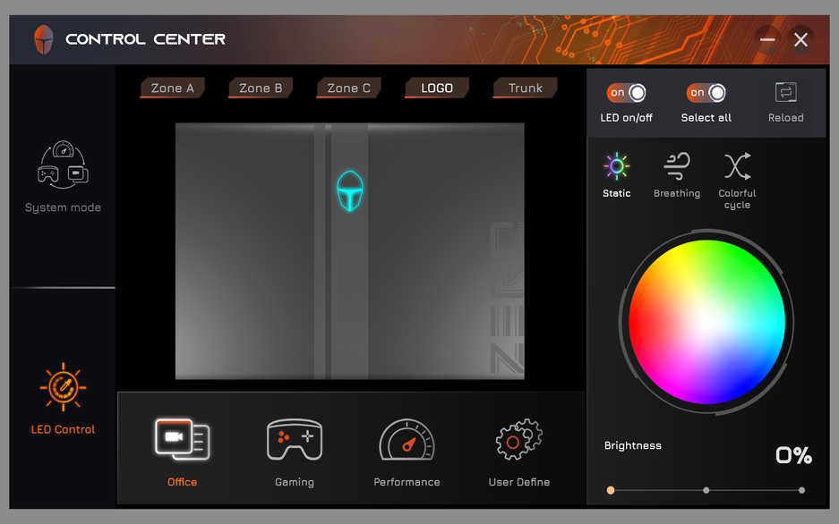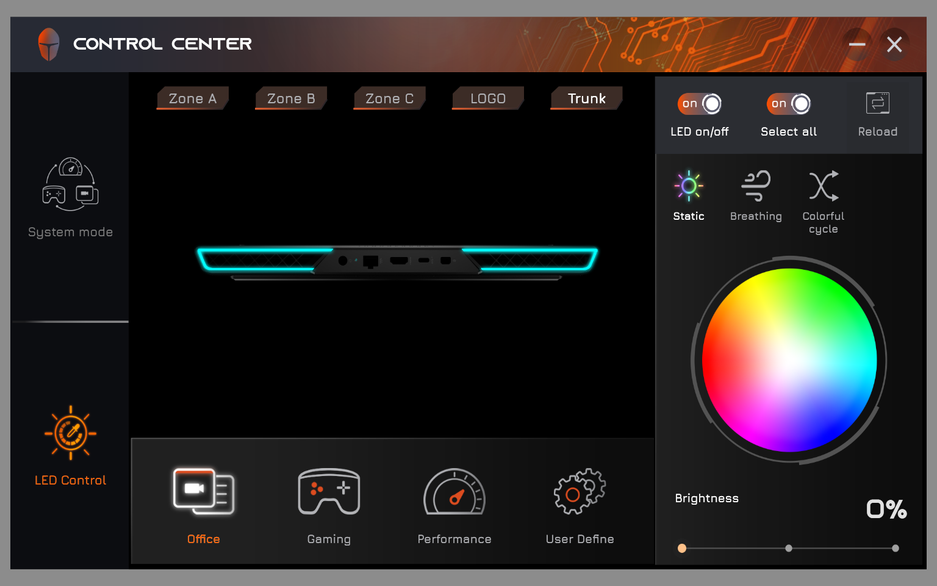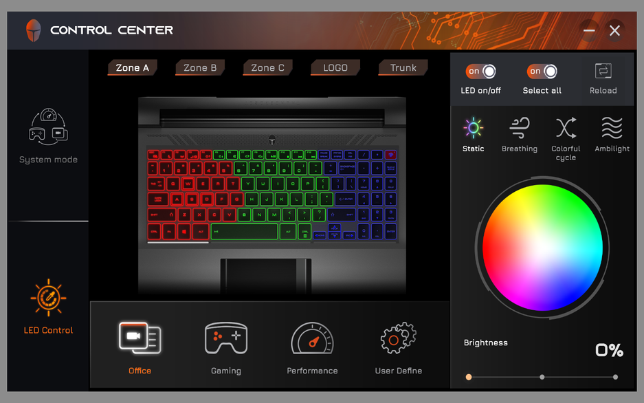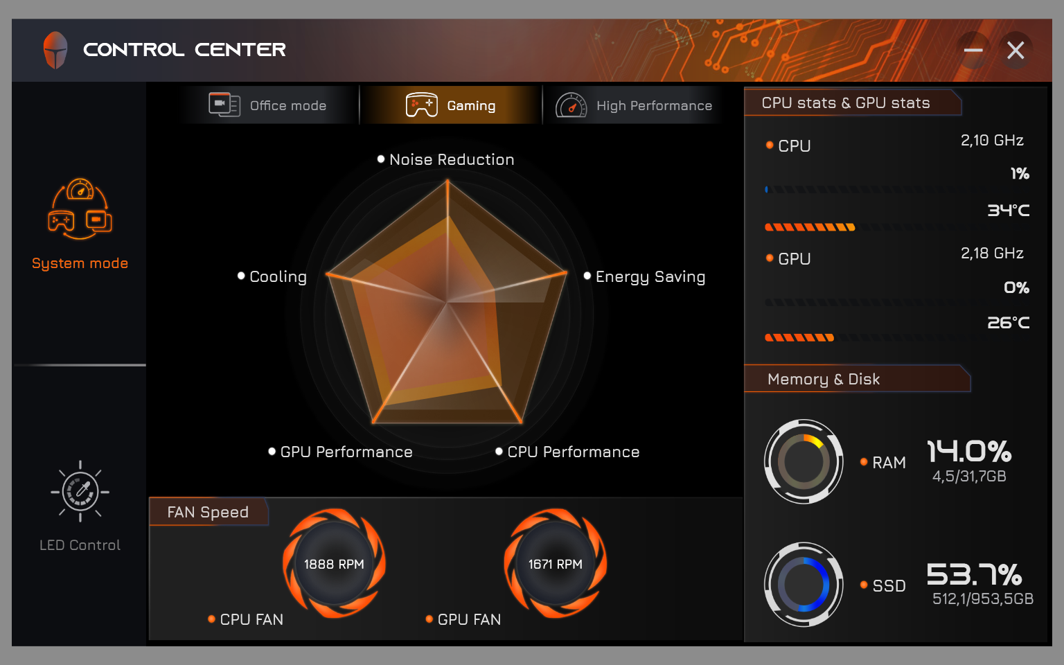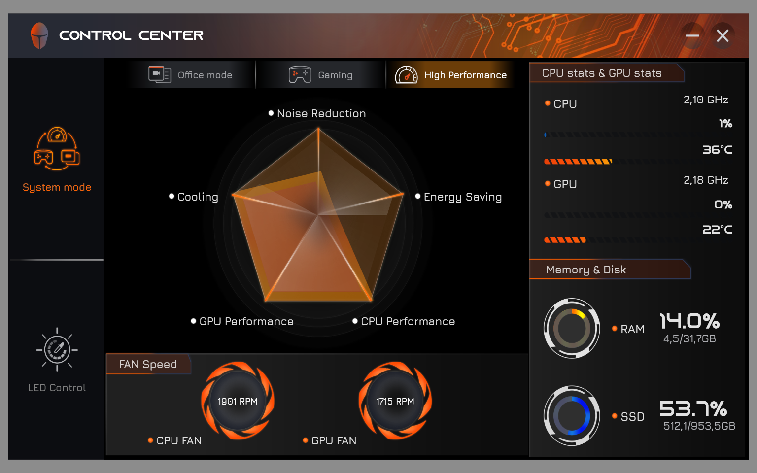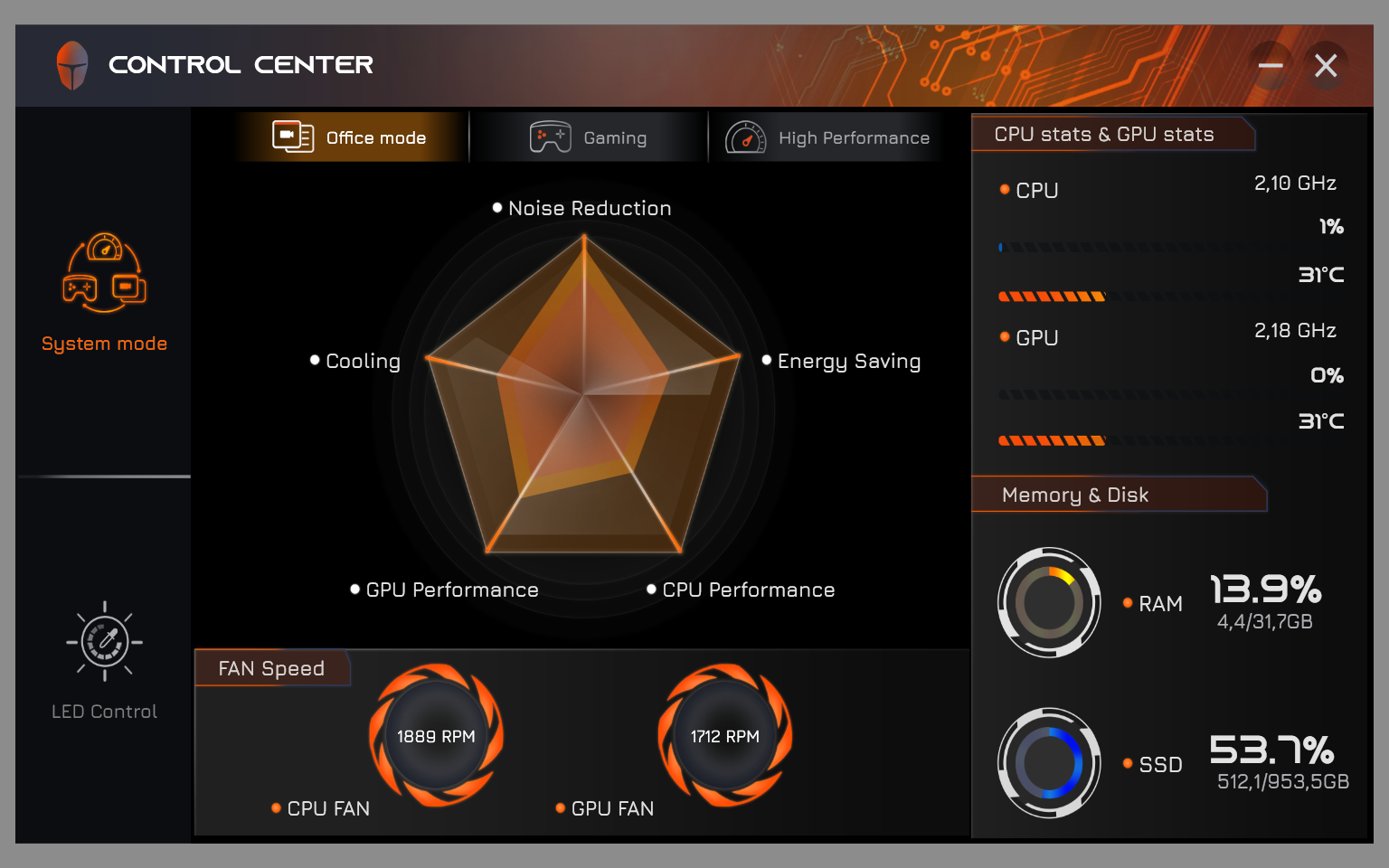 Утилита Control Center нам знакома по другим рассмотренным ноутбукам Thunderobot, а одну из её функций – управление RGB-подсветкой – мы упоминали чуть выше. Кроме этого, реализованы минимальные функции мониторинга, включая отображение скоростей вращения вентиляторов (в других утилитах вроде AIDA64 их посмотреть нельзя), а также выбор одного из трёх профилей производительности: Office mode, Gaming или High Performance.