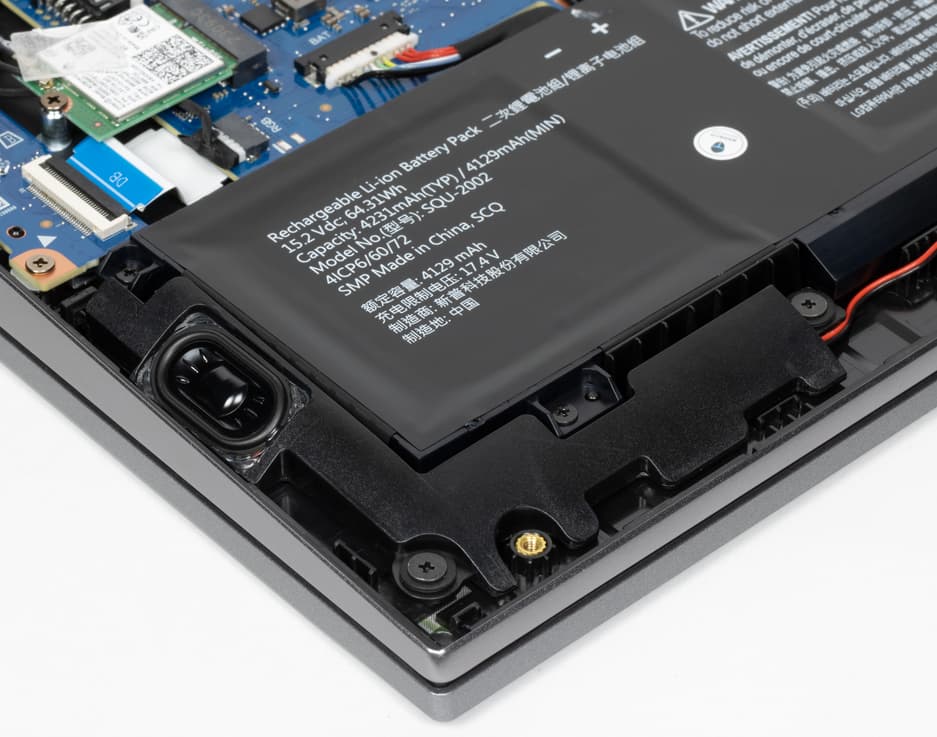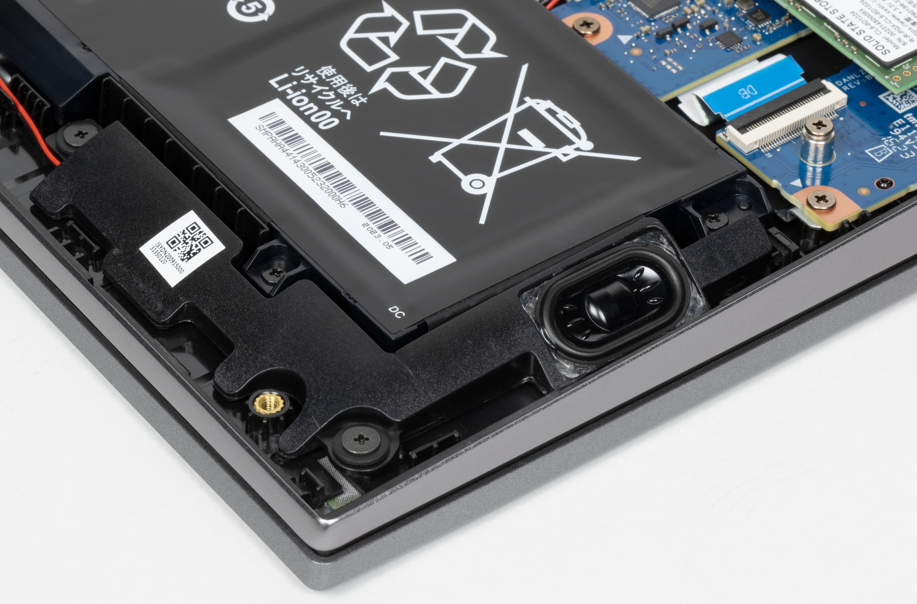 Больше всего места внутри ноутбука занимает системная плата с кулерами, остальное отведено под батарею, по бокам которой находятся динамики.
