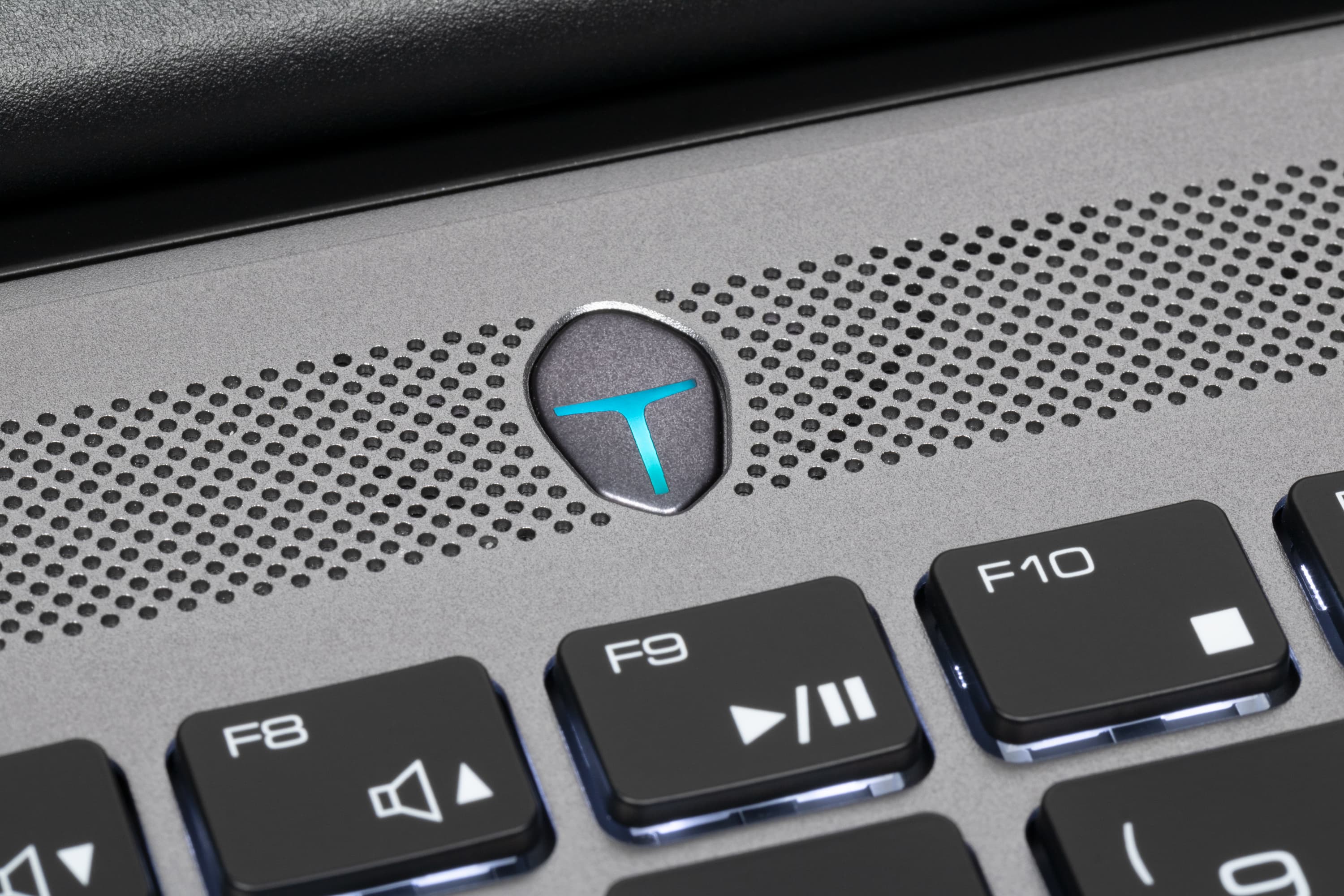 В середине полосы находится кнопка Power, при включении она подсвечивается, а без подсветки при первом знакомстве с ноутбуком её сразу и не заметишь: из-за специфической формы, соответствующей эмблеме бренда, она воспринимается как декоративный элемент. Кнопка установлена практически заподлицо с поверхностью, что вкупе с расположением исключает случайные нажатия.