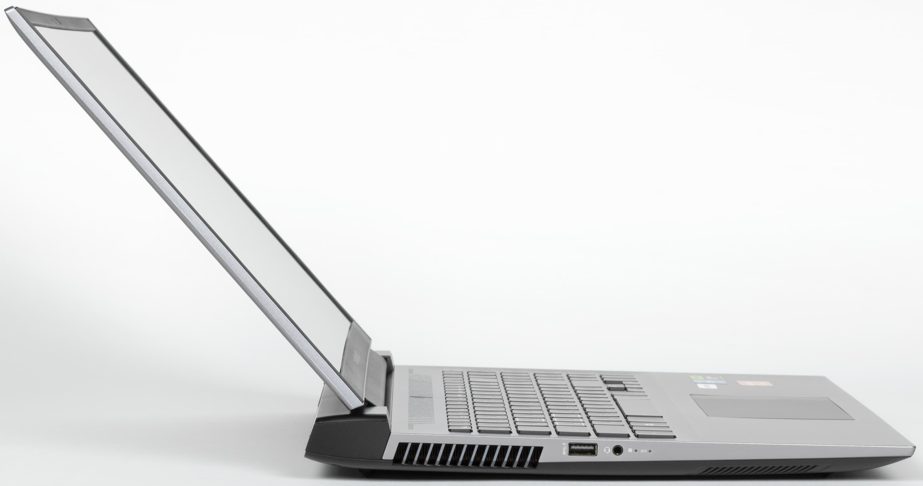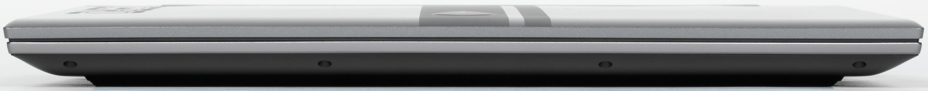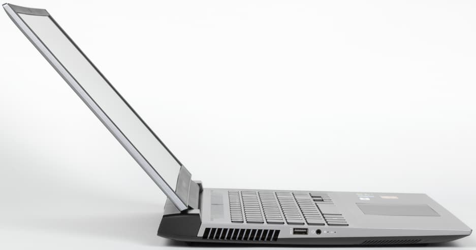 Благодаря закруглениям на нижней части у передней и боковых кромок аппарат выглядит тоньше, чем он есть на самом деле. Но по нашим измерениям толщина корпуса немалая и вполне типичная для игровых ноутбуков – 23,8/28,4 мм спереди и 28,5/33,8 мм сзади (без ножек/с ножками).