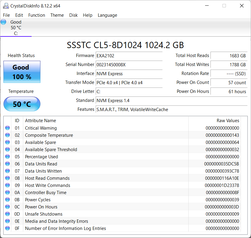 Используется SSD-накопитель на 1 ТБ с обозначением SSSTC CL5-8D1024 и интерфейсом PCIe 4.0 x4.