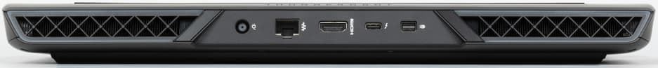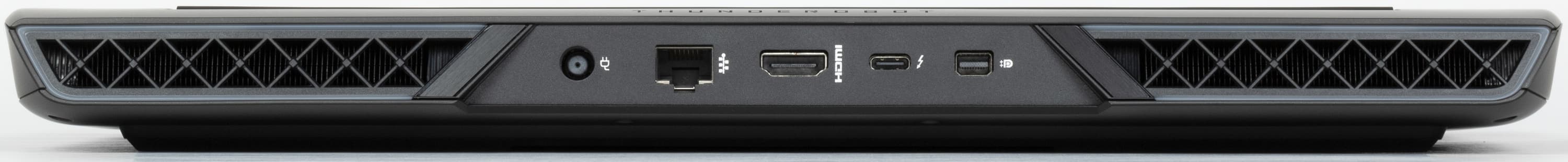 На заднем торце имеются гнездо питания (с индикатором, который горит при подключении внешнего БП), порты RJ-45 и HDMI (оба полноразмерные), USB Type-C с Thunderbolt 4 и Mini-DP.