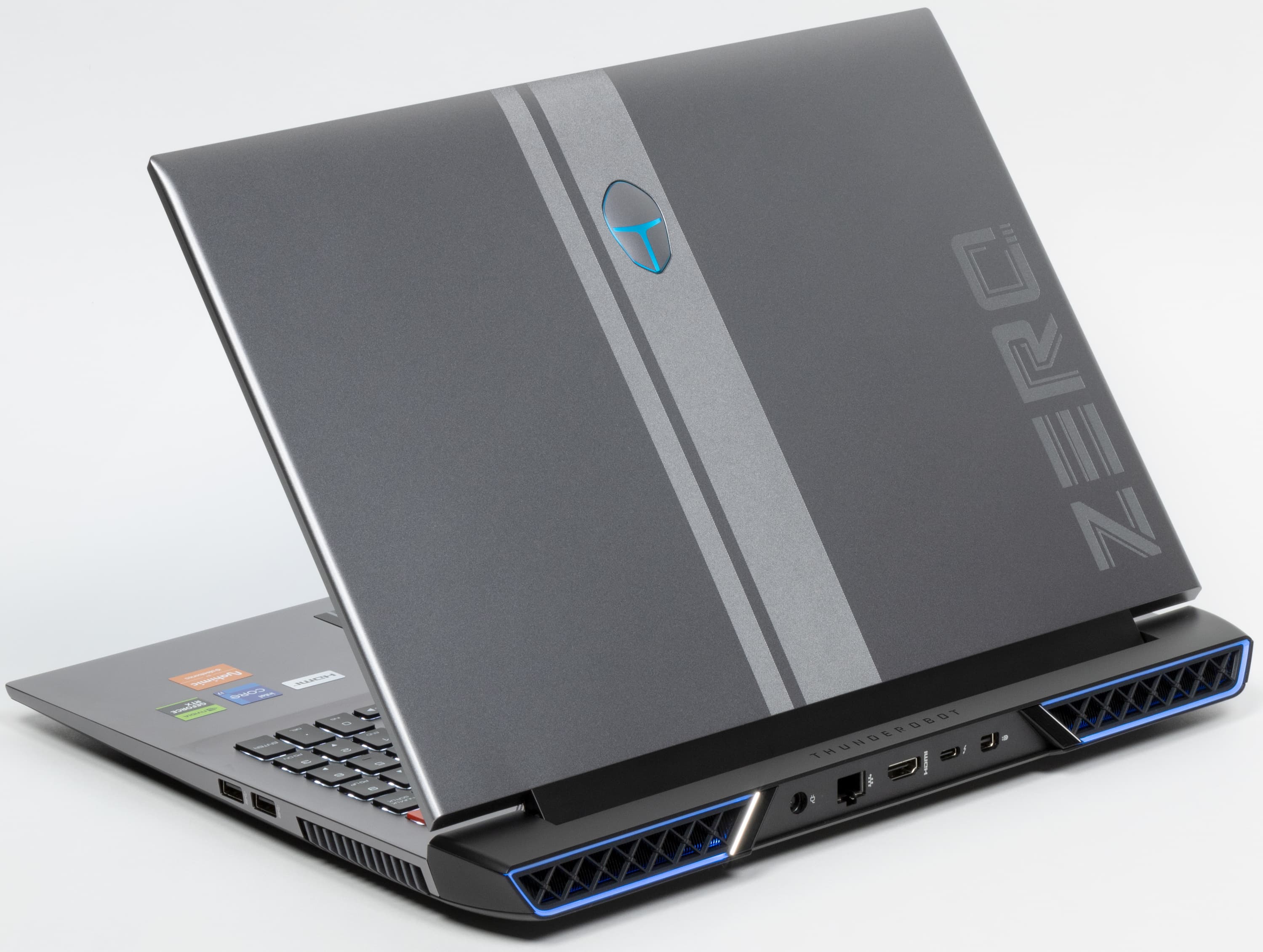 В оформлении корпуса сочетаются три даже не цвета, а скорее оттенка: наружная часть крышки с экраном и верхняя панель корпуса тёмно-серые с элементами декора в виде более светлых полос и надписи "ZERO", а нижний «поддон» корпуса, задняя часть ноутбука и рамка вокруг экрана гораздо темнее, практически чёрные. Все панели пластиковые, фактура поверхностей матовая с намёком на легкую шероховатость. Дизайн соответствует декларируемому игровому статусу: украшения есть (в том числе с RGB-подсветкой), но не слишком броские и разумном количестве.