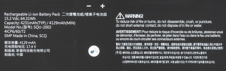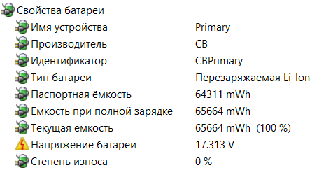 Заявленная ёмкость батареи составляет 64 Вт·ч, на ней самой обозначены близкие значения, которые подтверждаются и утилитами.