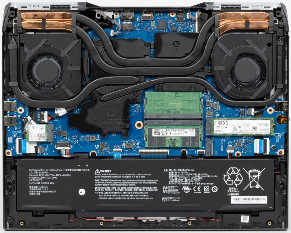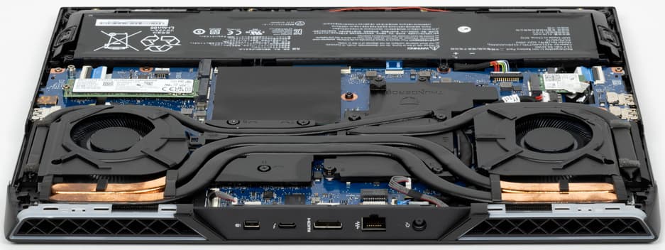 Компоновка системы охлаждения вполне типичная: два радиатора с вентиляторами разнесены на максимальное расстояние к углам корпуса, с теплосъёмниками на CPU и GPU они соединяются двумя общими и ещё двумя индивидуальными тепловыми трубками. Как уже говорилось, воздух всасывается через прорези в днище и выбрасывается назад (в основном) и по бокам сзади (частично).