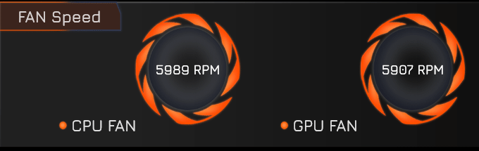 Изменение состояния вентиляторов отображается с существенной, до 15-20 секунд, задержкой. Можно увидеть, что минимальные скорости составляют около 1700-1900 оборотов в минуту, максимальные (по нажатию правой дальней кнопки) ближе к 6000 об/мин.