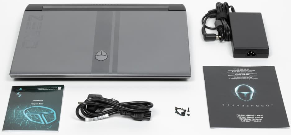 В комплекте, кроме самого ноутбука, идёт блок питания со сменным входным кабелем (длина 0,9 метра) и распаянным выходным (1,7 м, есть фиксатор-"липучка"), а также набор винтов и печатные материалы на русском языке.