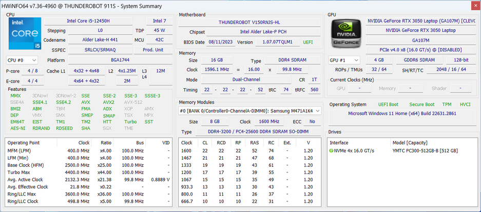 Для сравнения производительности в играх мы выбрали двух "собратьев" – Thunderobot 911 MT Pro D с таким же, как у героя нашего обзора, процессором и несколько более продвинутой видеокартой NVIDIA GeForce RTX 3060 Laptop, а также Thunderobot 911 X Wild Hunter G3 XD с более свежими CPU Intel Core i5-13500H (12 ядер/16 потоков, до 3,5/4,7 ГГц, 35/95 Вт) и видеоадаптером NVIDIA GeForce RTX 4050 Laptop. У обоих по 16 ГБ (2×8) DDR4-3200 Samsung.