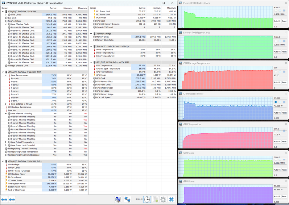 При подаче нагрузки на оба процессора P-ядра ЦП поначалу разгоняются до 3,2 ГГц, но менее чем через минуту их частота снижается до 2,1 ГГц; Е-ядра и тут работают с постоянной частотой 3,3 ГГц. Температура ЦП не превышает 84 °C (тротлинга нет), потребление до 60 ватт в пике и около 45 ватт в установившемся режиме.