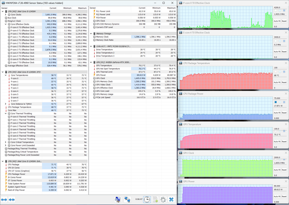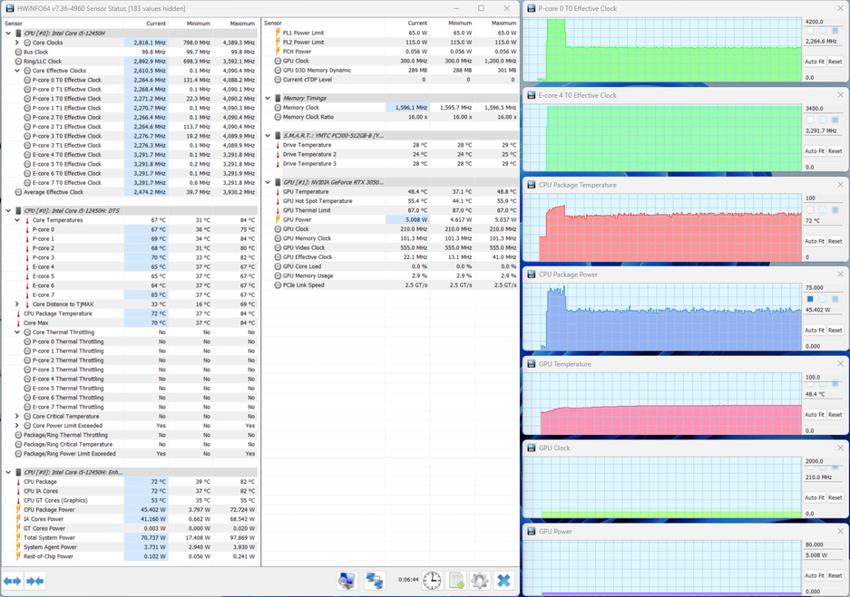 При подаче нагрузки (программа powerMAX) на CPU сначала действует режим Turbo Boost, в котором частота P-ядер CPU достигает 4,1 ГГц, E-ядер – 3,3 ГГц, его потребление повышается до 68-72 Вт (то есть не достигает заявленного для турборежима максимума в 95 Вт), а температура в пике до 84 °C, начинают раскручиваться вентиляторы, быстро достигая максимальных оборотов (судить приходится по звуку). Через полминуты происходит быстрый спад: частот P-ядер до 2,3 ГГц (Е-ядра продолжают работать на частотах около 3,3 ГГц), потребления до 42-47 Вт, вентиляторы снижают обороты до средних, а температура быстро уменьшается и стабилизируется на уровне 70-73 градусов. До тротлинга дело не доходит.