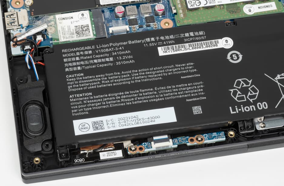 Больше всего места внутри ноутбука занимает системная плата с кулерами, остальное отведено под батарею и отсек для установки дополнительного 2,5-дюймового накопителя SATA толщиной до 7 мм, а по бокам находятся динамики.