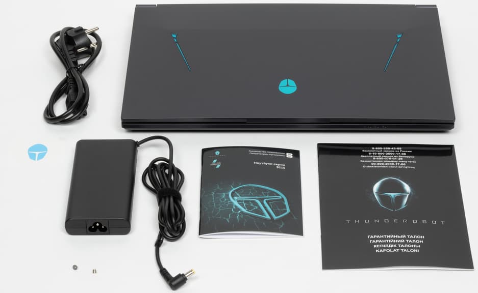 В комплекте, кроме самого ноутбука, идёт блок питания со сменным входным кабелем (длина 0,9 метра) и распаянным выходным (1,7 м, есть фиксатор-"липучка"), а также пара винтов для крепления дополнительного накопителя (мелочь, а приятно), наклейка-логотип и печатные материалы на русском языке.