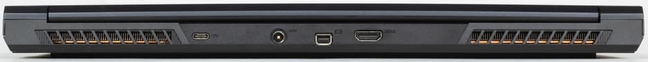 На заднем торце имеются гнездо питания, порты HDMI (полноразмерный), DisplayPort (mini) и USB3 Gen2 Type-C (без поддержки Power Delivery и вывода видеосигнала).